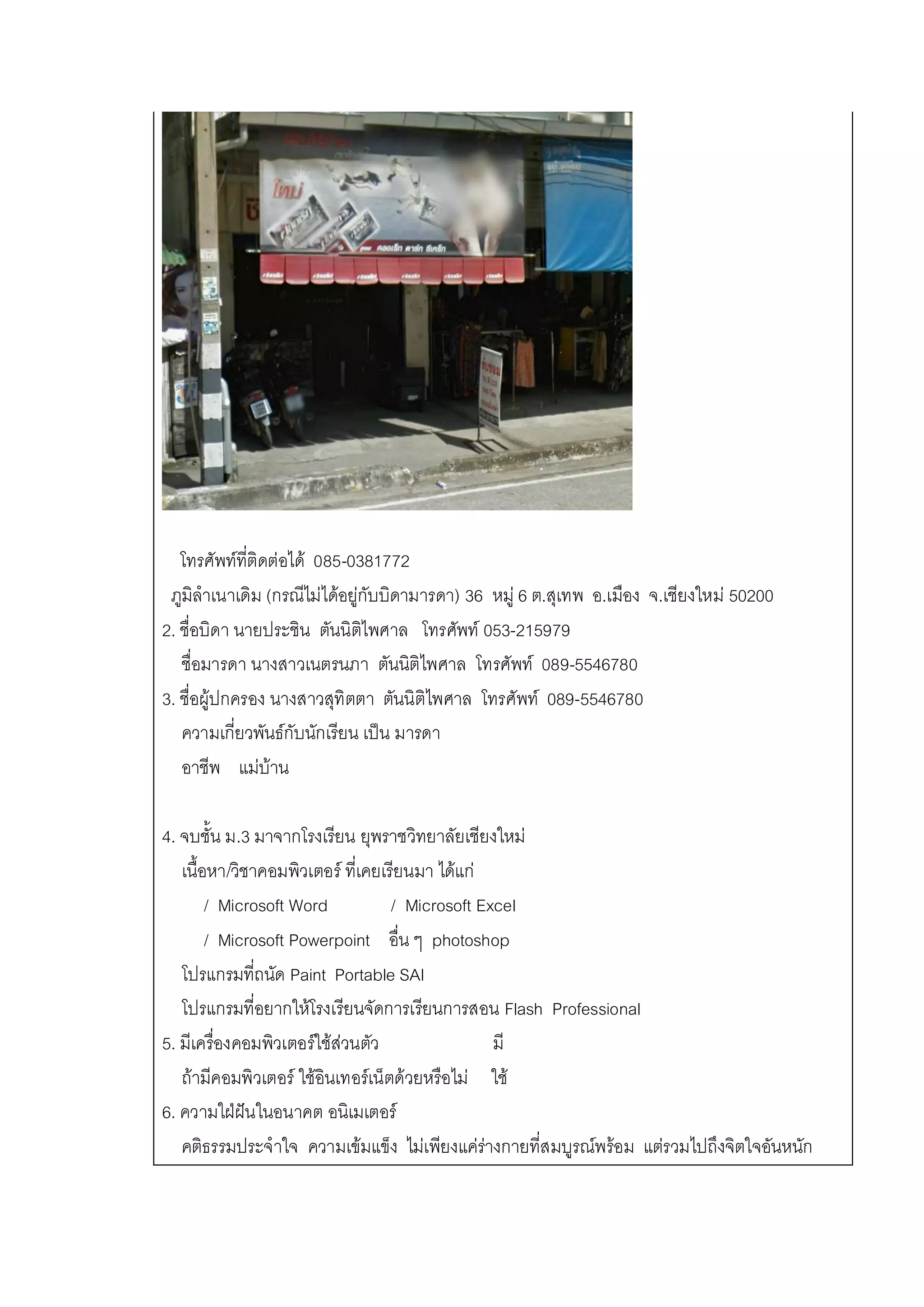 คะแนนเฉลี่ยมัธยมศึกษาตอนต้น 2.30 จากโรงเรียน ยุพราชวิทยาลัย จังหวัด เชียงใหม่ 8. คะแนนเฉลี่ย ม.5 –ไม่ทราบ- 9. ทักษะ/ความสามารถพิเศษ –ไม่มี- 10. การได้รับรางวัลเกียรติบัตร(ชื่อ-ได้รับจาก –ไม่มี- 11. อยากเรียนต่อด้านใด การทาเอนิเมชั่น หมายเหตุ - ปรับแต่งชิ้นงานให้เหมาะสมสวยงามแล้วบันทึกไฟล์เป็นนามสกุล .Pdf นาไปวางไว้ที่ บล็อกของ นักเรียน