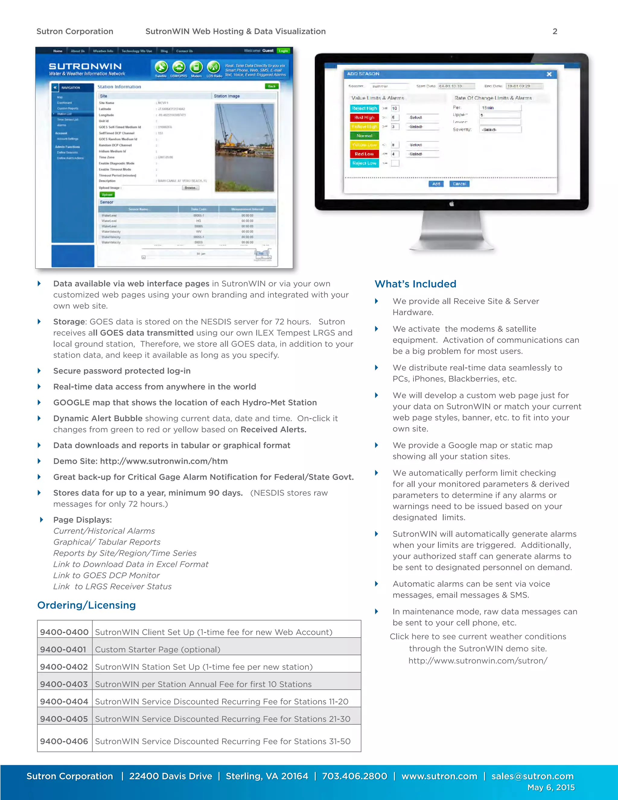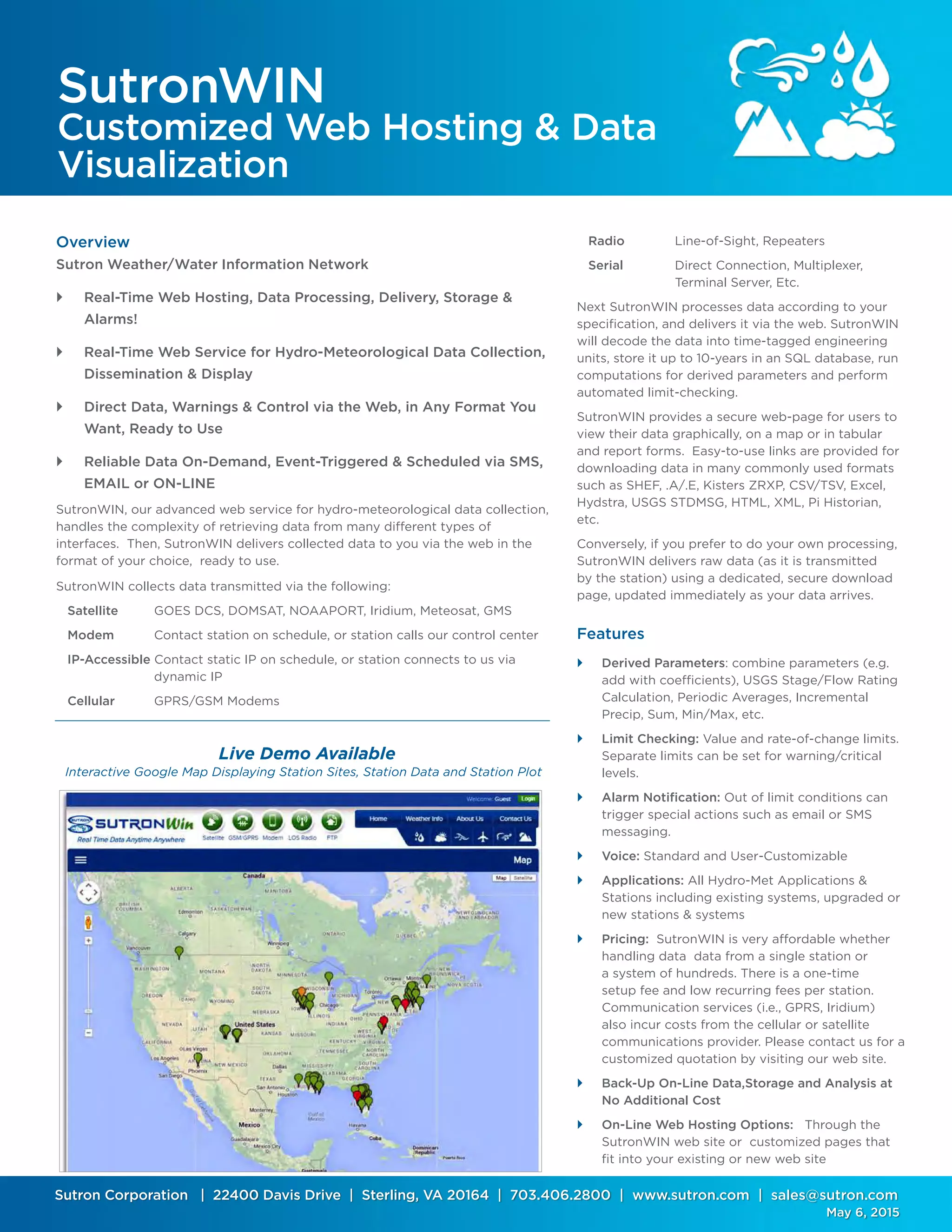 Sutronwin is a web hosting and data visualization service that enables real-time collection, processing, and dissemination of hydro-meteorological data. It offers features such as secure access, customizable data formats, alarm notifications, and extensive storage options, catering to both single and multiple station setups. The service includes one-time and recurring fees based on the number of stations, providing reliable data access and integration with existing systems.