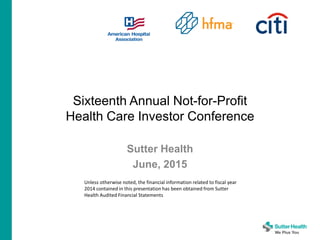 This document provides a summary of a presentation that will be given by executives from Sutter Health, a large non-profit health system, at an investor conference in June 2015. The presentation will provide an overview of Sutter Health, including its size, geographic reach, services provided, and recent financial performance. It also notes that the information being presented does not constitute a prediction of future financial performance and is subject to various risks and uncertainties.