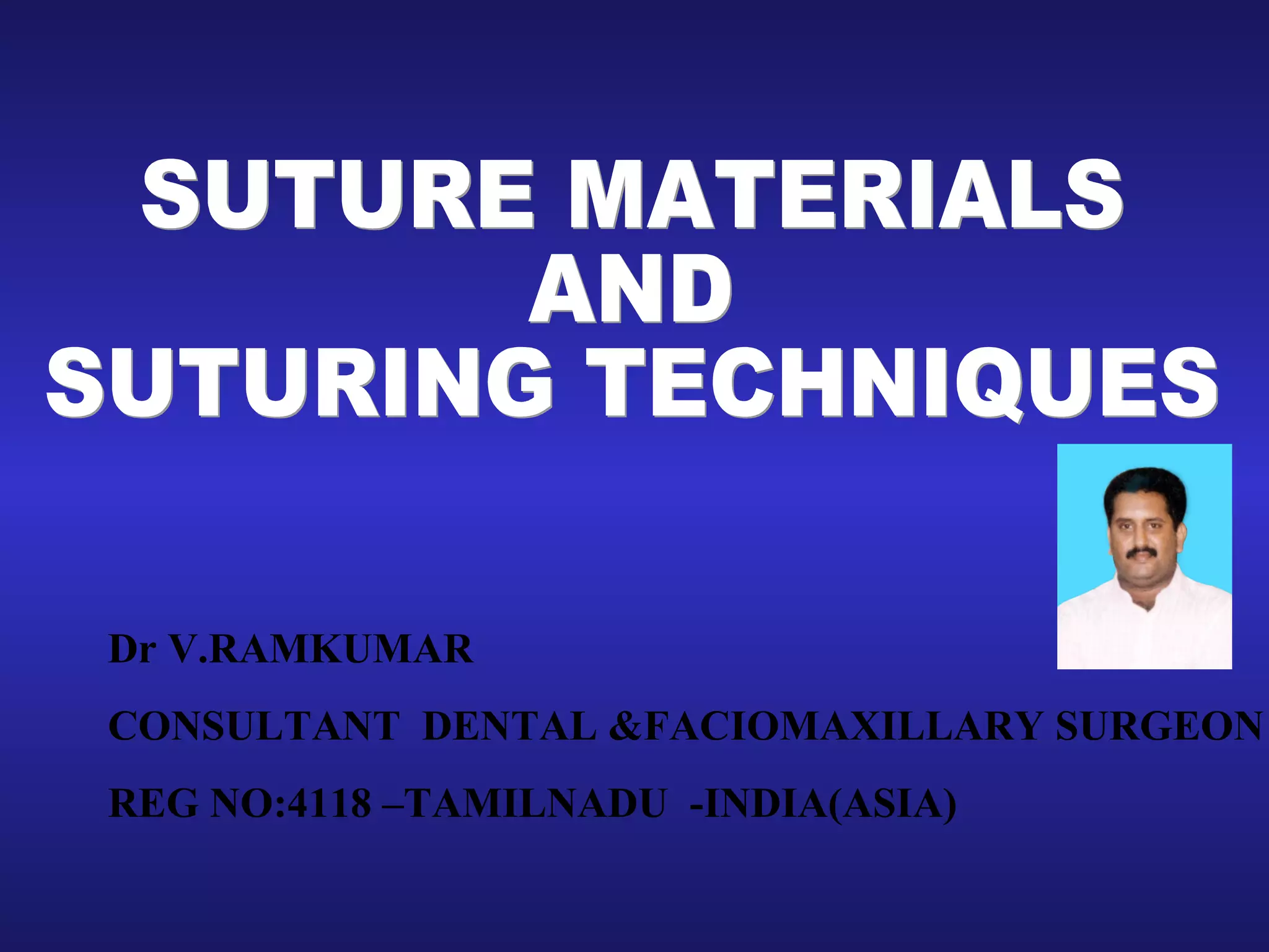 The document discusses different types of suture materials and techniques. It describes the properties of ideal suture materials and categorizes them as absorbable or non-absorbable. Common natural and synthetic materials are listed, along with their characteristics. Absorbable materials like catgut and polyglycolide are degraded over time in the body. Non-absorbable materials like silk require later removal. The document also covers suturing instruments, needles, and interrupted versus continuous suturing techniques.