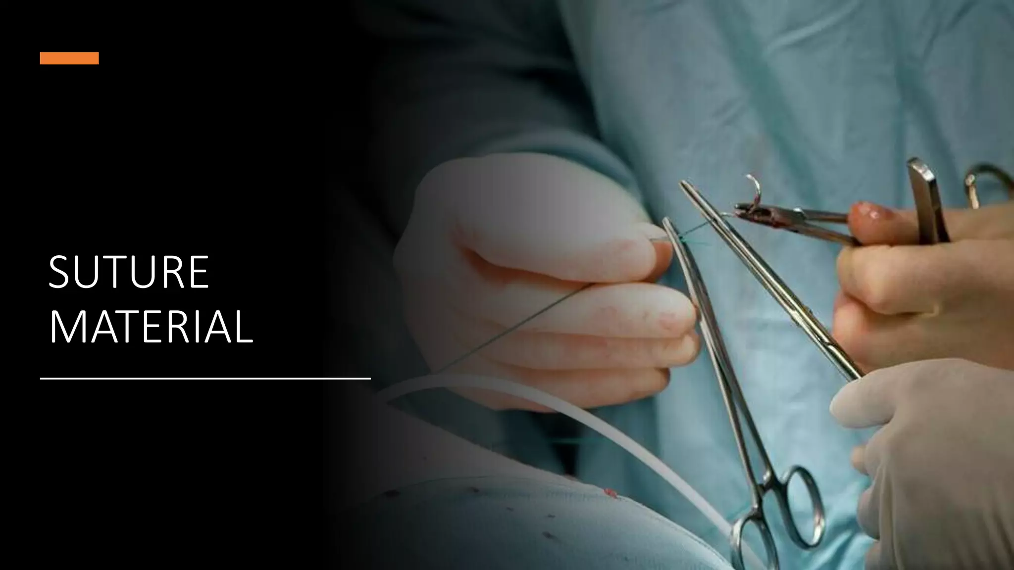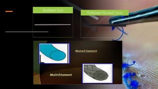 The document discusses sutures and suturing materials. It defines sutures as stitches used to approximate wound edges to help healing. Suture materials are synthetic fibers that hold wounds closed until natural scar tissue forms. The goals of suturing are wound edge apposition, tension, hemostasis, and infection prevention to produce a good scar. Suture characteristics include physical structure (monofilament or multifilament), tensile strength, absorbability, and biological behavior. Common suturing tools are needle holders, needles of varying shapes and tips, and materials like polypropylene, silk, and vicryl which are selected based on wound and tissue factors.