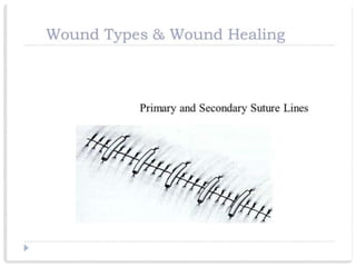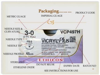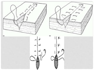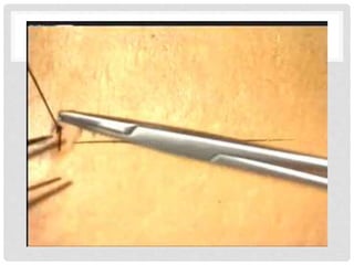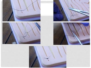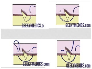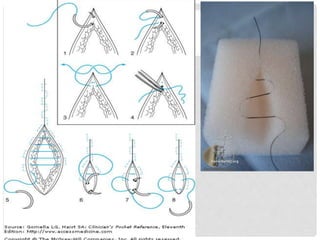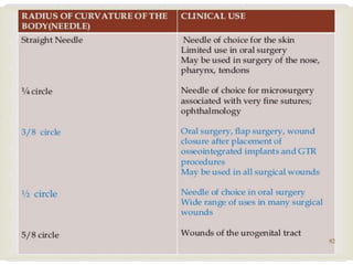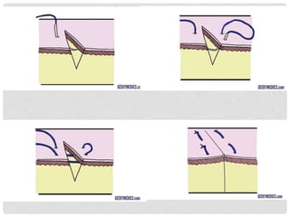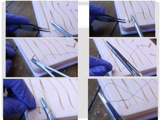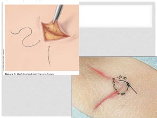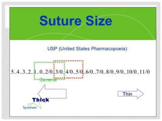 This document provides information on suture materials and techniques. It discusses the anatomy of skin, definitions of suturing terms, goals of suturing, ideal suture requirements, suturing armamentarium including needles and needle holders. It also covers various suture materials like catgut, silk, nylon, linen; their properties, manufacturing process, sterilization methods and uses. Principles of suture selection and different suturing techniques are also explained.