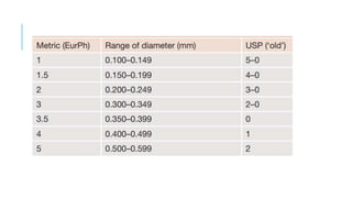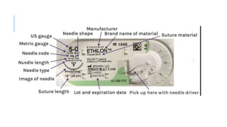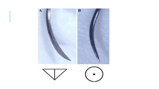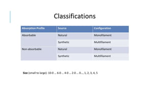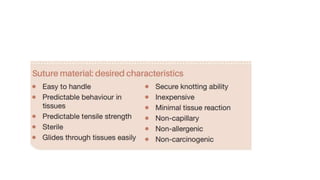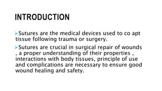 This document discusses suture materials, essential for attaching tissue post-surgery or injury. It outlines the characteristics, types (absorbable and non-absorbable), and behaviors of various sutures, including monofilament and multifilament options. Understanding these factors is crucial for effective healing and minimizing complications.