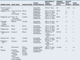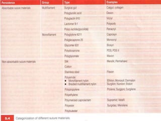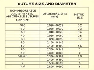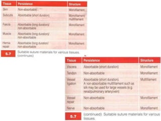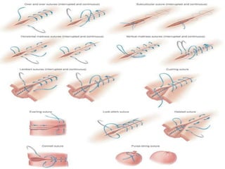 Sutures are threads used to unite wound edges and are made from absorbable materials like catgut, collagen and synthetic polymers, or non-absorbable materials like silk, cotton and synthetic polymers like nylon and polypropylene. The document describes characteristics of different suture materials and various suturing techniques including apposition, inversion, eversion, and purse-string sutures as well as factors to consider like tissue strength and wound condition when selecting sutures. Common absorbable sutures mentioned are catgut, collagen