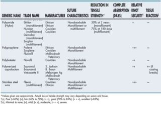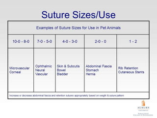 This document discusses sutures, suture materials, and suturing patterns used in veterinary practice. It covers the following key points in 3 sentences: