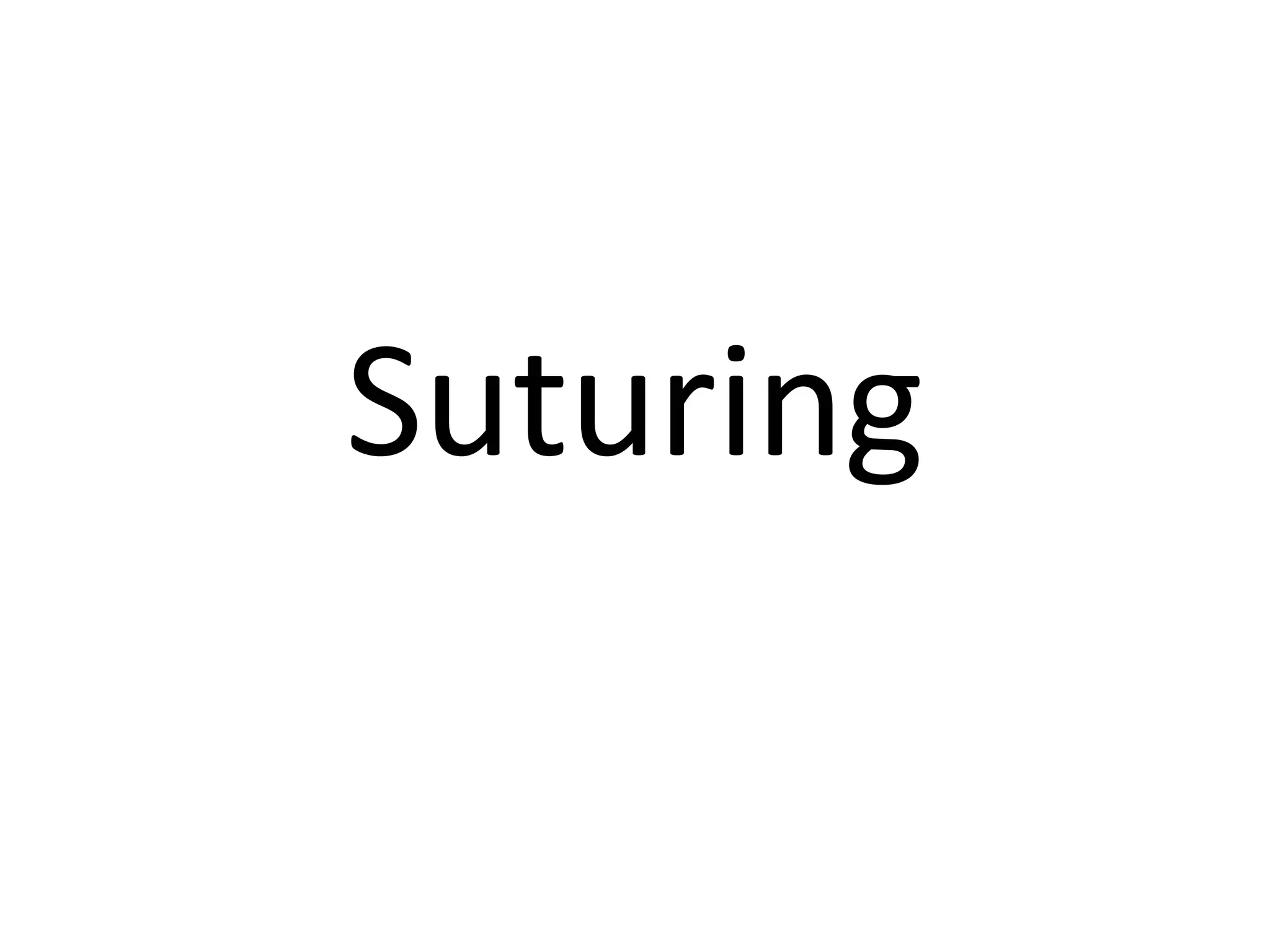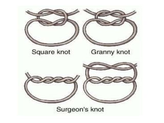 Suturing involves using threads or strands to approximate tissue surfaces and wound edges to assist in healing. There are absorbable and non-absorbable suture materials, including catgut, polyglycolic acid, polypropylene, and nylon. Absorbable sutures like polyglycolic acid degrade within 4-6 months by hydrolysis, while non-absorbable sutures like polypropylene must be removed after wound healing. Proper suturing technique includes perpendicular needle entry, equal depth and distance of placement, and avoidance of tension on tissues.