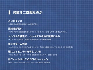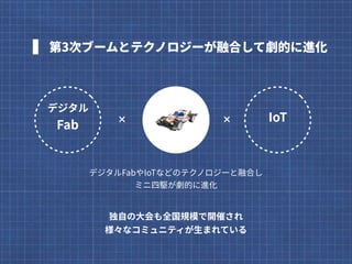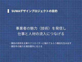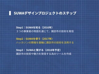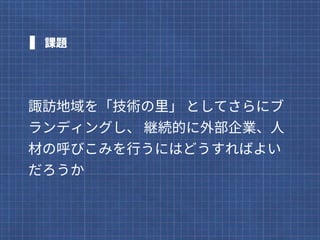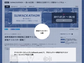 長野県諏訪市とタッグを組み、諏訪市が世界に誇る精密加工技術の魅力を発見し発信するを2016年から行っています。 2年目の2017年、精密技術の魅力を発見し発信するために、選んだテーマは、あのミニ四駆です。 子供から大人まで気軽にものづくりを楽しめるミニ四駆を、地域の技術とどう結びつけたのか。3ヶ月に渡ったプロジェクトの概要をスライドにまとめました。