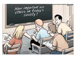 This document provides an overview of ethics and related concepts. It defines ethics as the study of right and wrong conduct, and notes there are three central concepts: good, right, and ought. It discusses virtue ethics, deontological ethics, consequentialism, and how they differ based on character, actions, and consequences. The document also covers civic ethics, professional ethics, codes of ethics, and what constitutes an ethical person and responsible citizenship. It provides examples of civic duties and rights in Tanzania. Overall, the document serves as an introduction to ethics by defining key terms and comparing different ethical approaches.