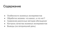 Документ представляет собой анализ биоинформатических аспектов полноэкзомного секвенирования, включая важность контроля качества, методы обработки и аннотацию значимости генетических вариаций. Рассматриваются различные технологии и их эффективность в оценке экзомов, а также сравнительные характеристики методов обогащения. Заключение подчеркивает необходимость сотрудничества с биоинформатиками и постоянного обмена информацией для достижения лучших результатов.