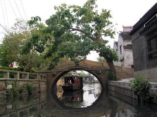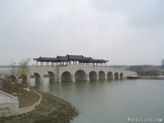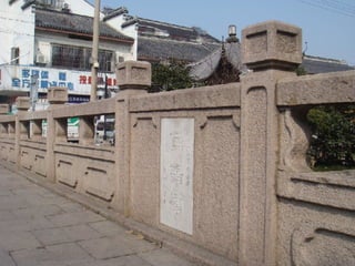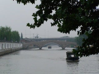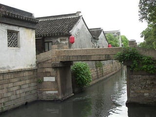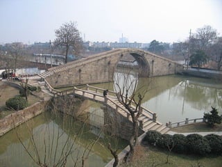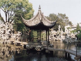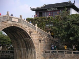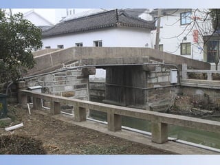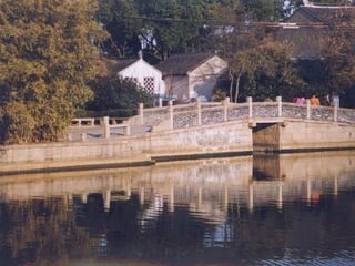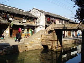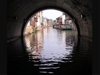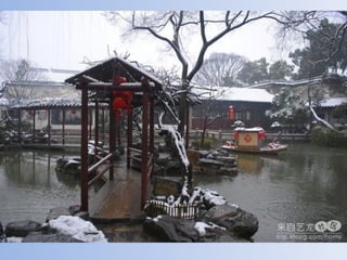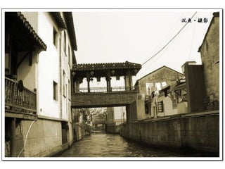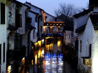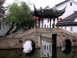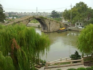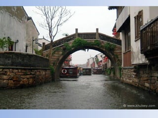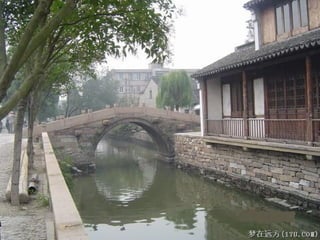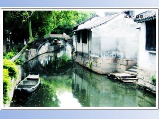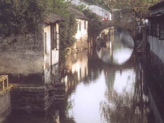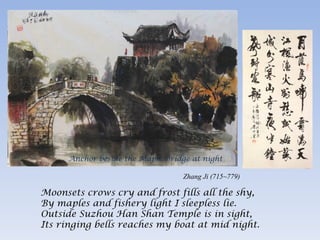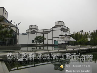 Suzhou is famous for its many canals and bridges, with over 175 bridges located within the city's outer ring. The document discusses a poem written by Zhang Ji in the 8th century describing a night where he lies sleepless on his boat near maple trees and fishermen, able to hear the bells of Han Shan Temple in the distance across the water. It also notes the musical piece "Beyond the Water" played on the guzheng instrument.