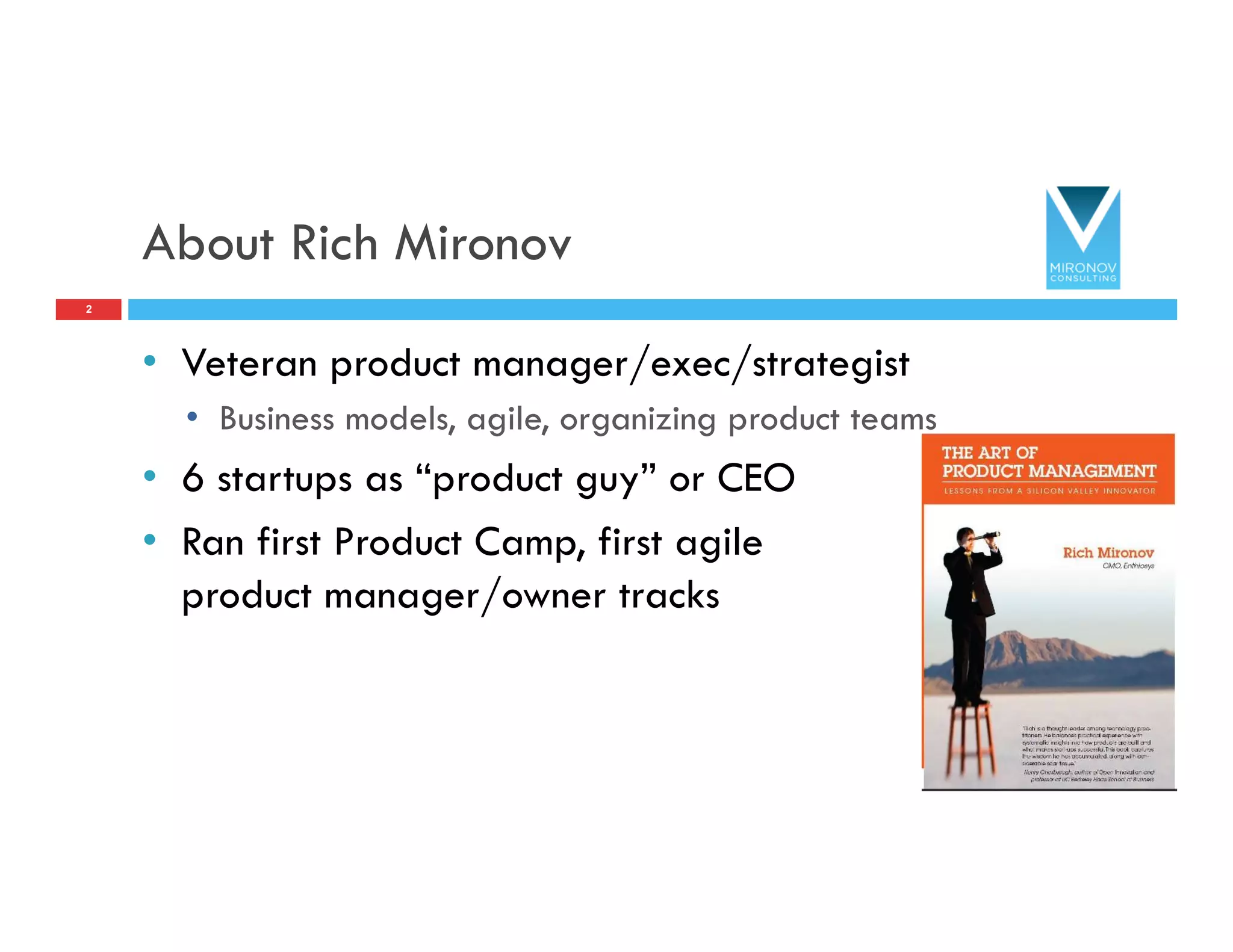 Rich Mironov discusses the differences between product managers and product owners in agile development. He outlines common failure modes when these roles are not properly defined or staffed. For larger organizations, Mironov proposes organizational maps that divide responsibilities between product managers and multiple product owners across several agile teams, to ensure products have both technical and market focus. The presentation emphasizes the need to thoughtfully assign these critical roles rather than using a one-size-fits-all approach.