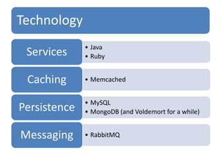 The document discusses the components and challenges of building a social platform, including technology, user profiles, relationships, and activity streams. It emphasizes the importance of flexibility in design, infrastructure, and processes, along with performance optimization strategies such as caching and scaling. Additionally, it notes the need for effective integration, automated testing, and the use of various technologies like RabbitMQ and NoSQL databases for managing social interactions efficiently.
