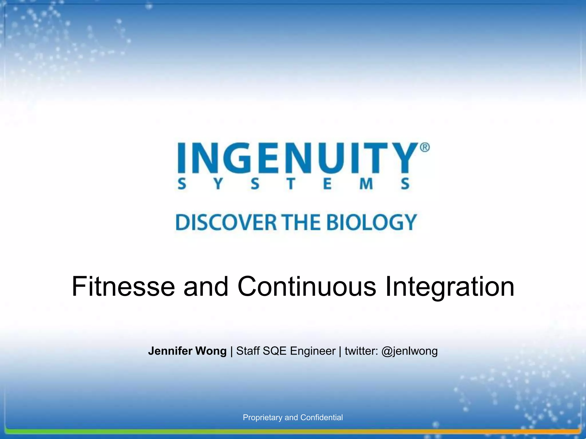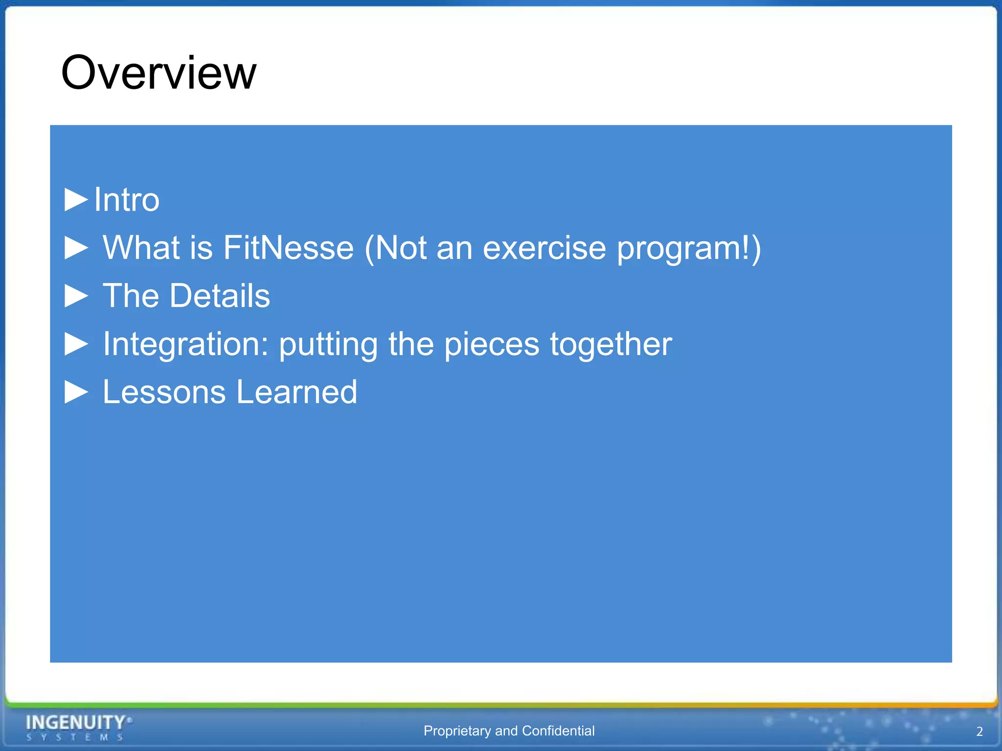 The document discusses FitNesse, a wiki-based web server test tool utilized in continuous integration workflows, highlighting its benefits, such as ease of use for non-technical individuals and its applications for various test types while noting its limitations. It covers installation details, basic test structures, variable usage, and integration with other tools like Hudson/Jenkins. Lessons learned emphasize the value of FitNesse for visibility and straightforward verification, albeit with challenges related to flexibility and maintenance.