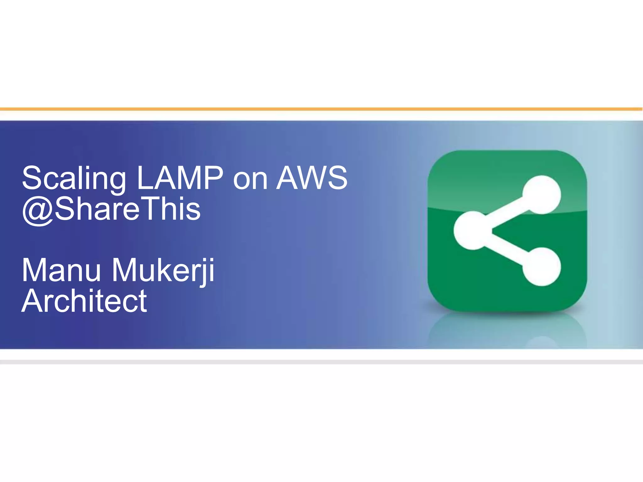 This document discusses how to scale a LAMP stack on Amazon Web Services. It provides tips for optimizing infrastructure components like EC2, S3, and SQS. It also offers recommendations for caching with Memcached, using efficient web servers like Nginx, optimizing images/CSS, keeping HTML/PHP/JavaScript simple and fast, and leveraging CDNs. The overall goal is to make the web experience as speedy as possible for users.