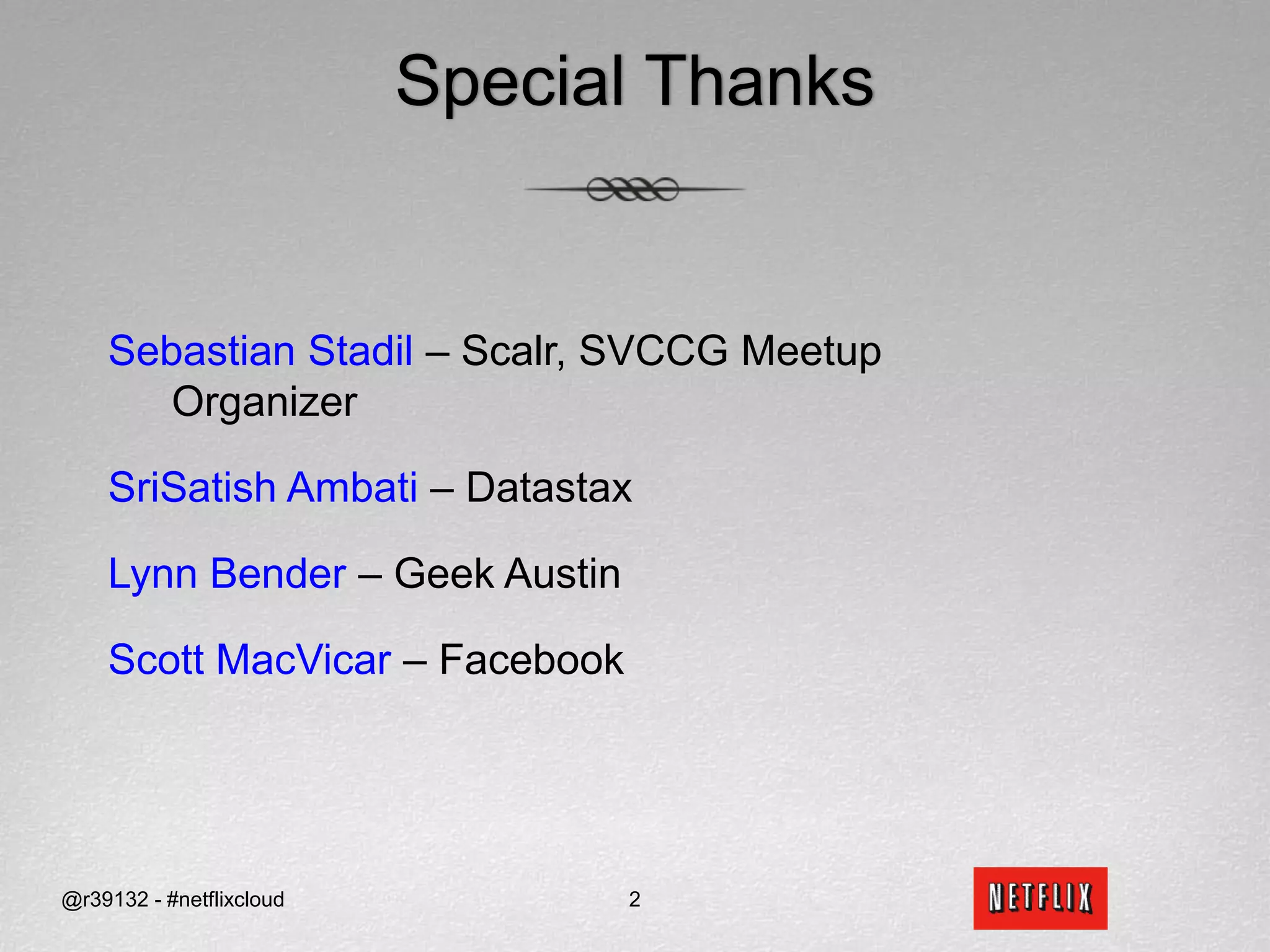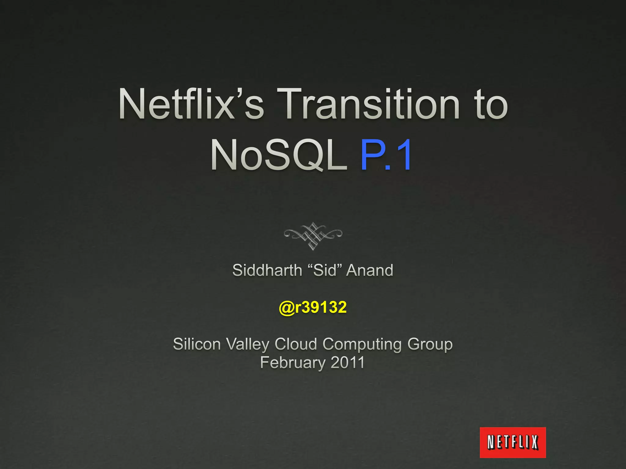 Netflix migrated to the cloud to avoid single points of failure and to focus on their core competencies. They chose Amazon Web Services and migrated non-sensitive data and applications to the cloud. Netflix picked SimpleDB and S3 as their data stores in the cloud. Migrating from an RDBMS required translating relational concepts like normalization to key-value stores and working around issues with SimpleDB like lack of data types and transactions.