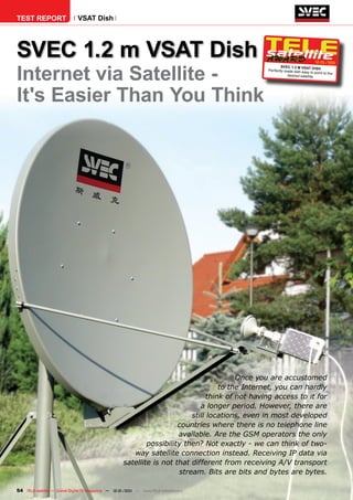 The document is a test report for a SVEC 1.2m VSAT dish. It discusses that the dish is perfectly made and easy to point to the desired satellite. It notes that receiving internet via satellite is not much different than receiving video transport streams, as bits and bytes are the same. The report also provides information on how to download the report in multiple languages and provides a link to more information on the SVEC company.
