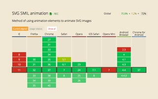 Документ описывает различные способы отображения SVG в браузерах, включая использование background-image, тег <img>, а также встраиваемые элементы <object>, <embed> и <iframe>. Упоминается о возможностях использования <symbol> и <use> для управления SVG, а также о методах кэширования и асинхронной загрузки SVG-файлов. Важные плюсы и минусы таких методов также обсуждаются, включая их кроссбраузерную совместимость и необходимость использования JavaScript.