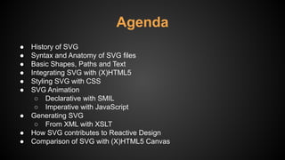 The document provides a comprehensive overview of Scalable Vector Graphics (SVG), detailing its history, syntax, basic shapes, and integration with HTML5. It also covers styling with CSS, SVG animation techniques, and the generation of SVG from XML. Key benefits of SVG include scalability, interactivity, and efficiency for various applications such as graphs, icons, and diagrams.