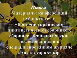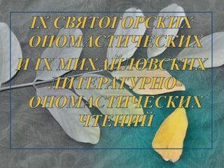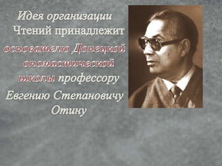 Документ посвящен чтениям по вопросам ономастики и поэтонимологии, которые проходят с 17 по 20 октября 2014 года в заочном формате. В этом году на конференциях представлено более 40 докладов ученых из Украины, России и Казахстана. Организаторы чтений - профессор Евгений Степанович Отин и профессор Валерий Михайлович Калинкин, работа которых включает научные материалы и исследования в области ономастики.