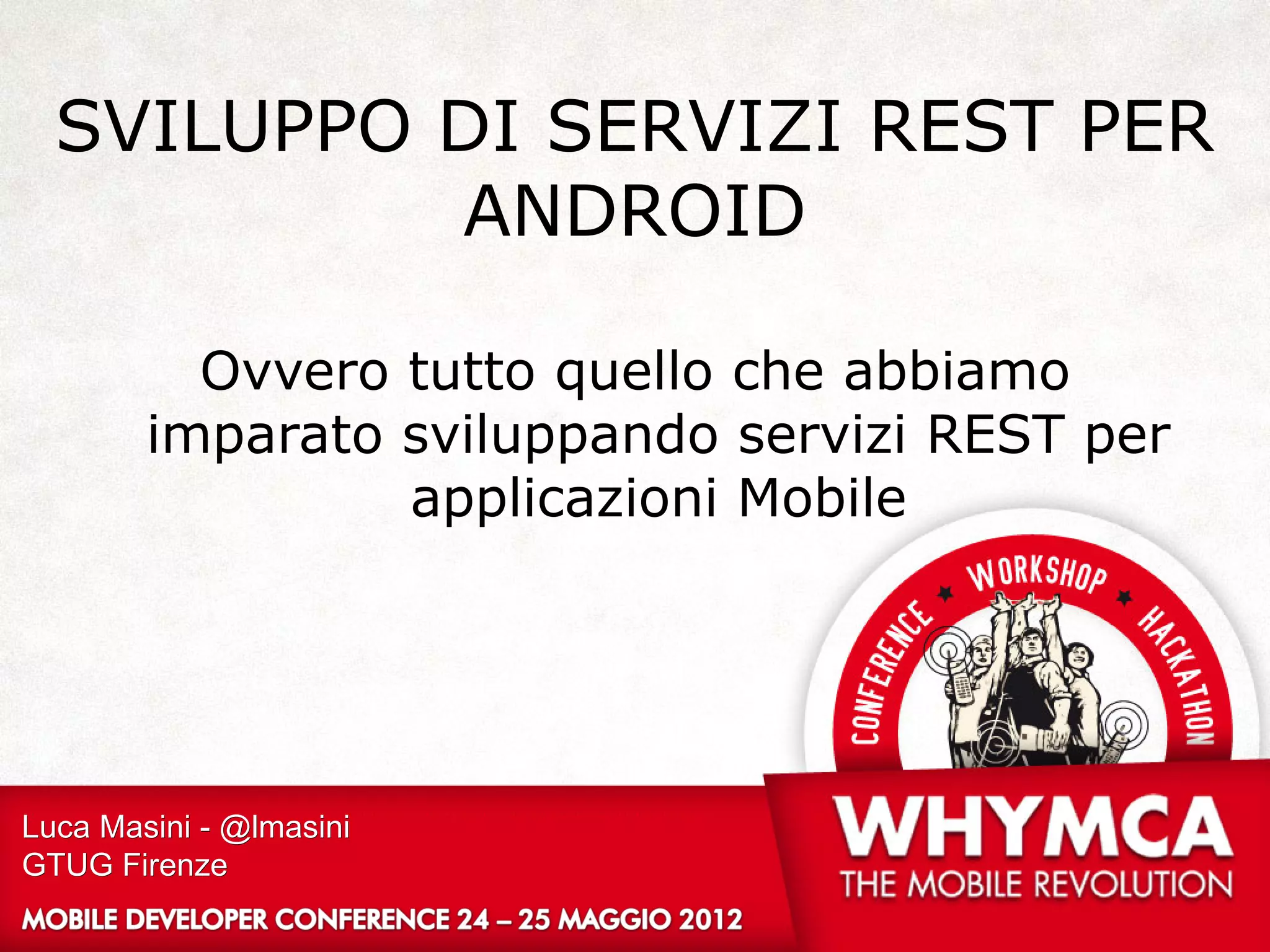 Il documento discute lo sviluppo di servizi REST per applicazioni Android, evidenziando architettura, sicurezza e versioning. Si sottolinea l'importanza della scalabilità e dell'ottimizzazione per diverse piattaforme, oltre a dettagli tecnici sull'implementazione e sull'uso di caching. Viene inoltre affrontata la gestione della compatibilità durante l'evoluzione dei servizi.