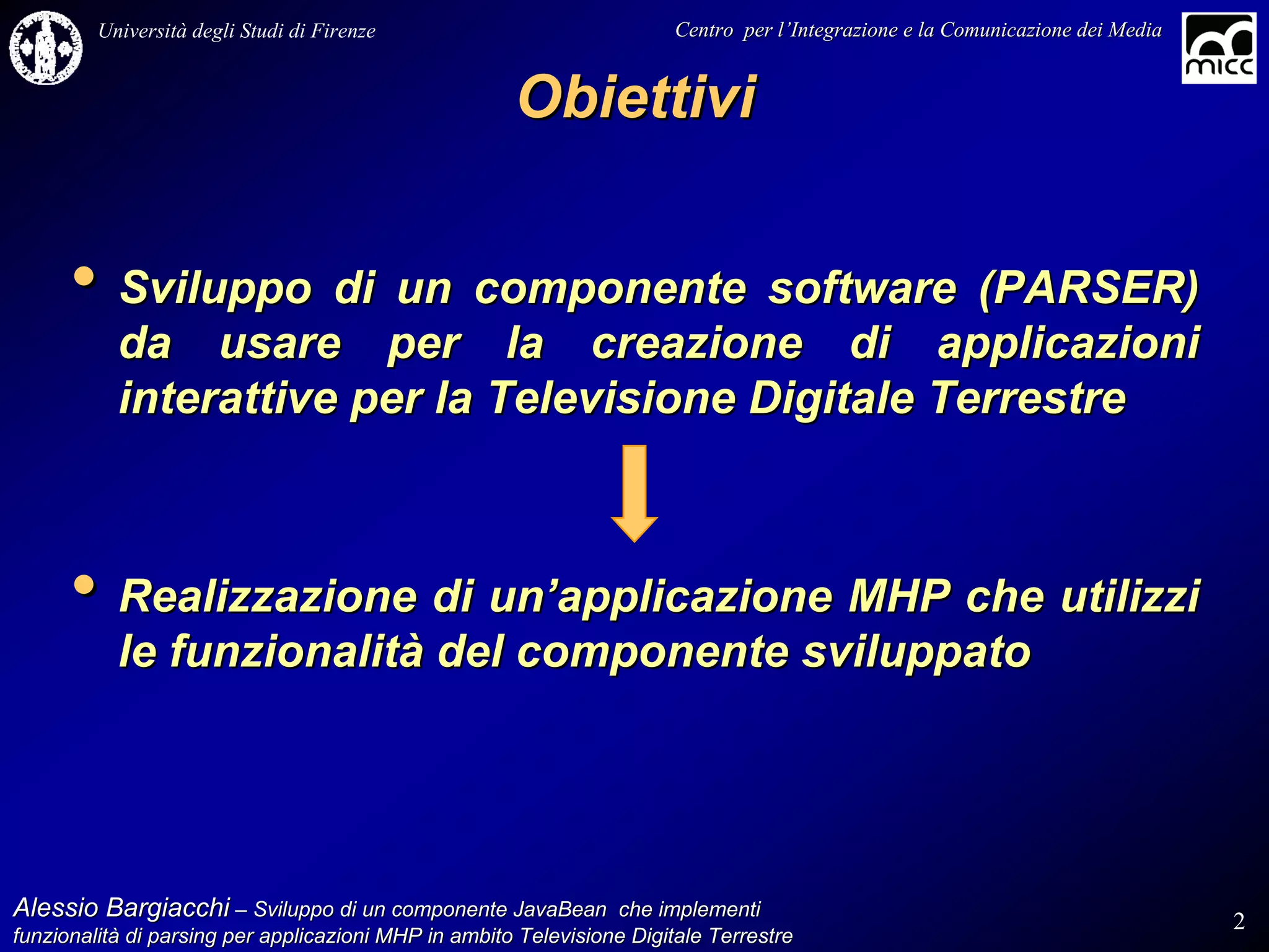 La tesi di laurea di Alessio Bargiacchi descrive lo sviluppo di un componente javabean per il parsing di applicazioni interattive nella televisione digitale terrestre (MHP). Il lavoro comprende la creazione di un'applicazione che sfrutta il componente sviluppato, evidenziando l'importanza del parsing per la gestione di dati XML in contesti interattivi. Le prospettive future includono l'uso del parser in vari ambiti, come il turismo e i servizi di pubblica utilità.