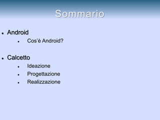 La tesi di laurea si concentra sullo sviluppo di un'app Android per la gestione di un impianto sportivo calcistico. Viene trattato l'intero processo che include ideazione, progettazione, e realizzazione dell'app, utilizzando strumenti come UML e PHP. Infine, si discutono le possibili evoluzioni future dell'app, come l'integrazione di un database locale e funzionalità di geolocalizzazione.