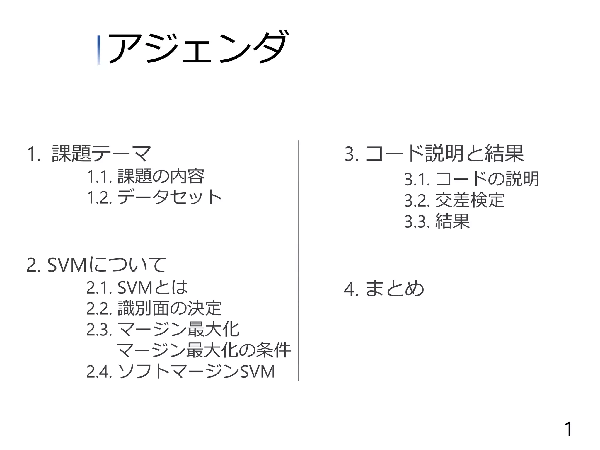 データセット 2. SVMについて 2.1. SVMとは 2.2. 識別面の決定 2.3. マージン最大化 マージン最大化の条件 2.4. ソフトマージンSVM 3. コード説明と結果 3.1. コードの説明 3.2. 交差検定 3.3. 結果 4. まとめ アジェンダ 1