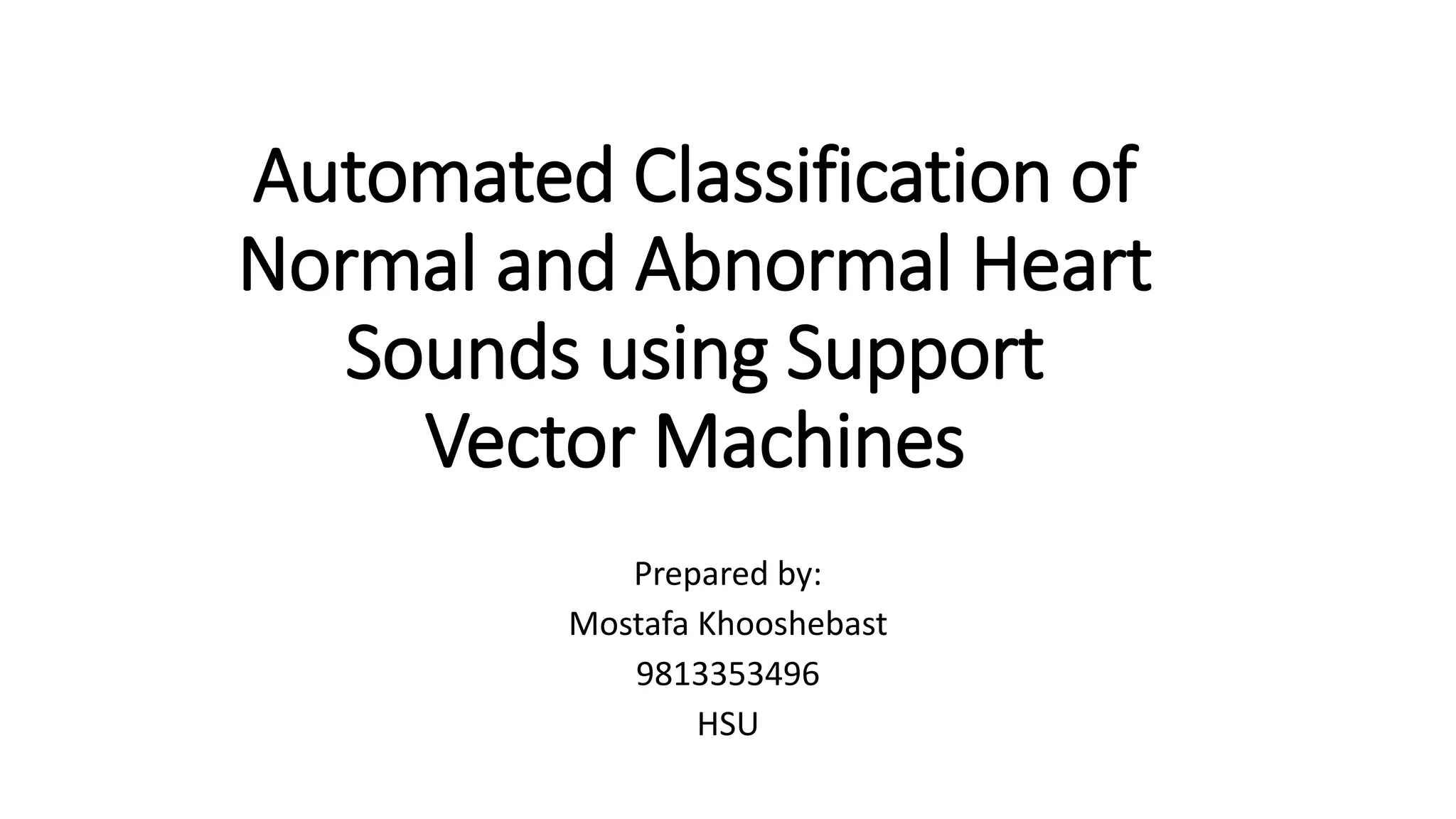 This document describes a study that used support vector machines to automatically classify heart sounds as normal or abnormal. Over 3000 phonocardiogram recordings from healthy and pathological adults and children were provided. 74 time and frequency domain features were extracted from the recordings and used to train an SVM classifier. The best classification accuracy achieved on the hidden test set was 78.64%, demonstrating the ability of SVM classifiers to accurately identify normal and abnormal heart sounds.