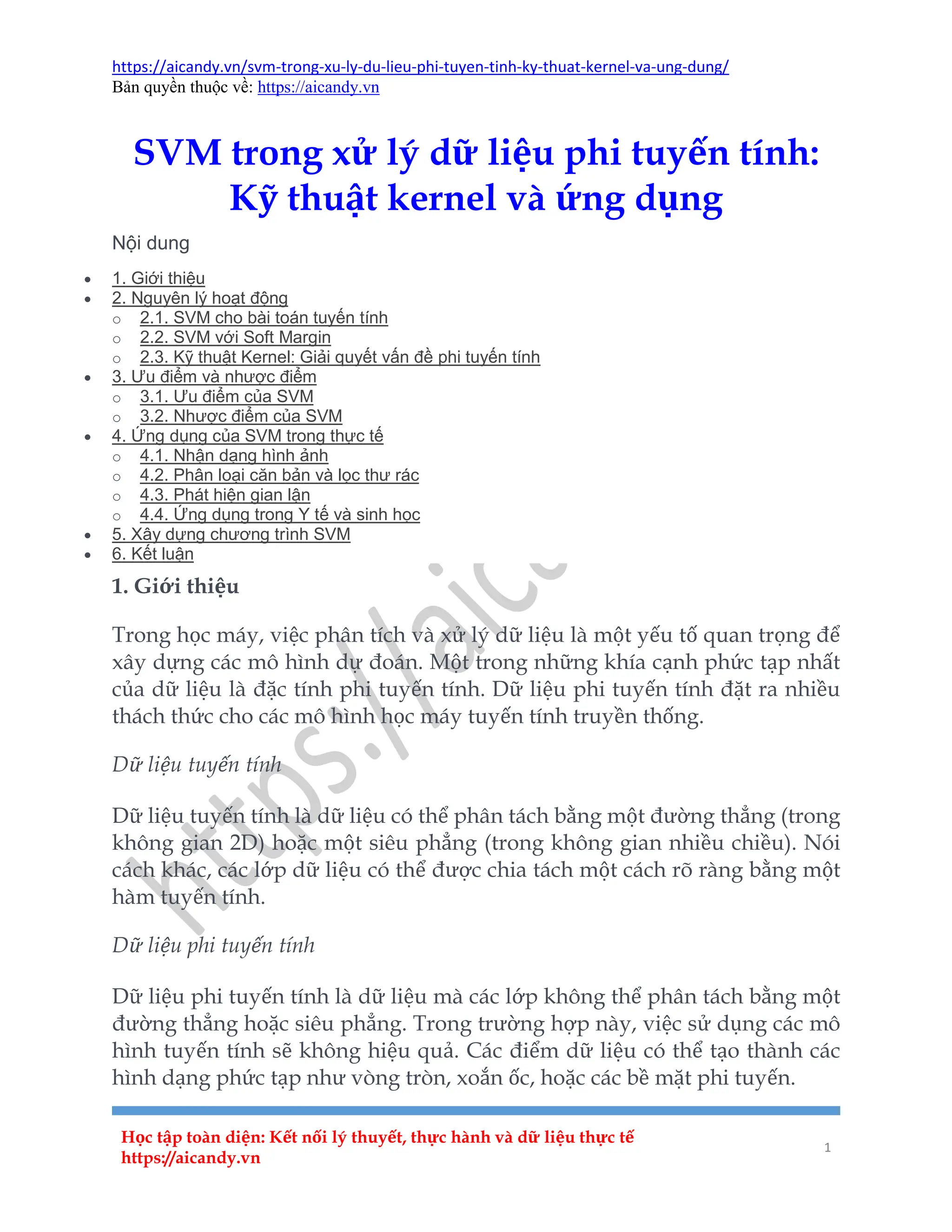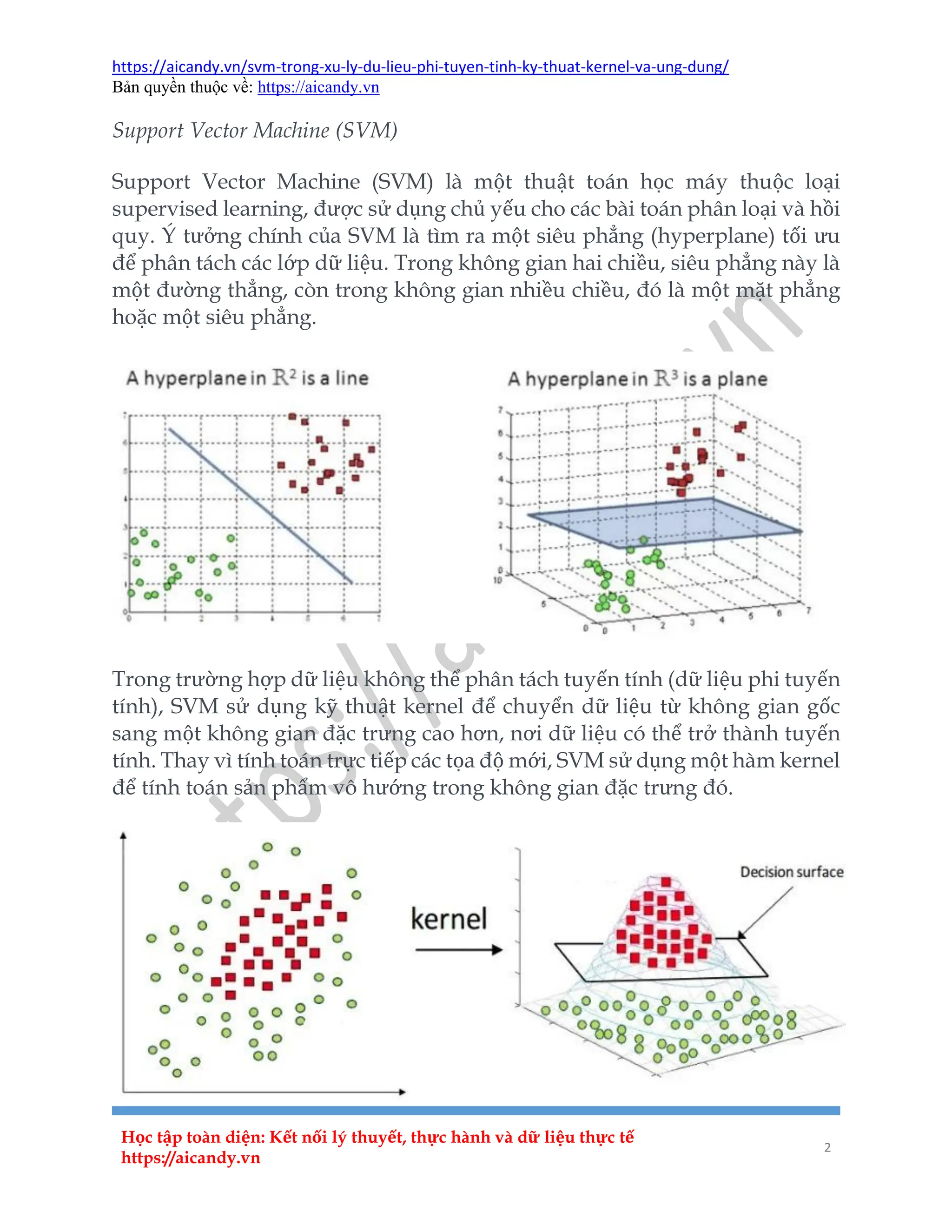 Support Vector Machine (SVM) là một thuật toán học máy sử dụng để phân loại và hồi quy, với nền tảng là tìm ra một siêu phẳng tối ưu để phân tách các lớp dữ liệu. SVM có khả năng xử lý dữ liệu phi tuyến tính thông qua kỹ thuật kernel, biến đổi dữ liệu sang không gian đặc trưng cao hơn khi cần thiết. Ứng dụng của SVM rộng rãi trong các lĩnh vực như nhận dạng hình ảnh, phân loại văn bản, phát hiện gian lận và phân tích y tế.