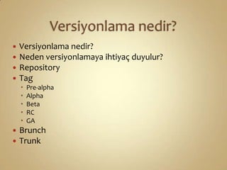 SubVersioN (SVN)2000 yılındaCollabNet tarafından geliştirildi.2009 yılında ApacheFoundation IncubatorOpen Source & Apache LisansTüm işletim sistemlerini desteklerSunucu – İstemci mimarisiAtomik Operasyon desteği sunar(ya hep, ya hiç)Yeniden isimlendirme, taşıma v.b. İşlemler versiyonlama yapmaya devam eder.Berkley DB, FSFS dosyalama sistemini kullanır.