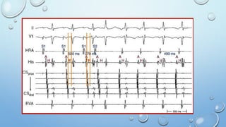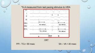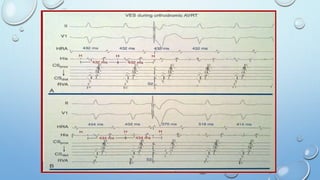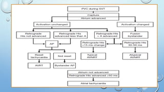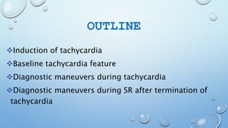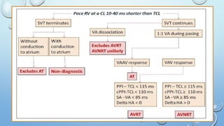 This document outlines techniques for differentiating supraventricular tachycardia (SVT). It discusses diagnostic maneuvers that can be performed during tachycardia and after termination, including induction methods, baseline tachycardia features, and effects of pacing. Key findings that help differentiate atrioventricular nodal reentry tachycardia (AVNRT), atrioventricular reentry tachycardia (AVRT), and atrial tachycardia include the response to atrial and ventricular extrastimuli, entrainment properties, delta AH/HA intervals with pacing, presence of AV or VA block, and retrograde atrial activation patterns. Parahisian pacing can also provide useful information by