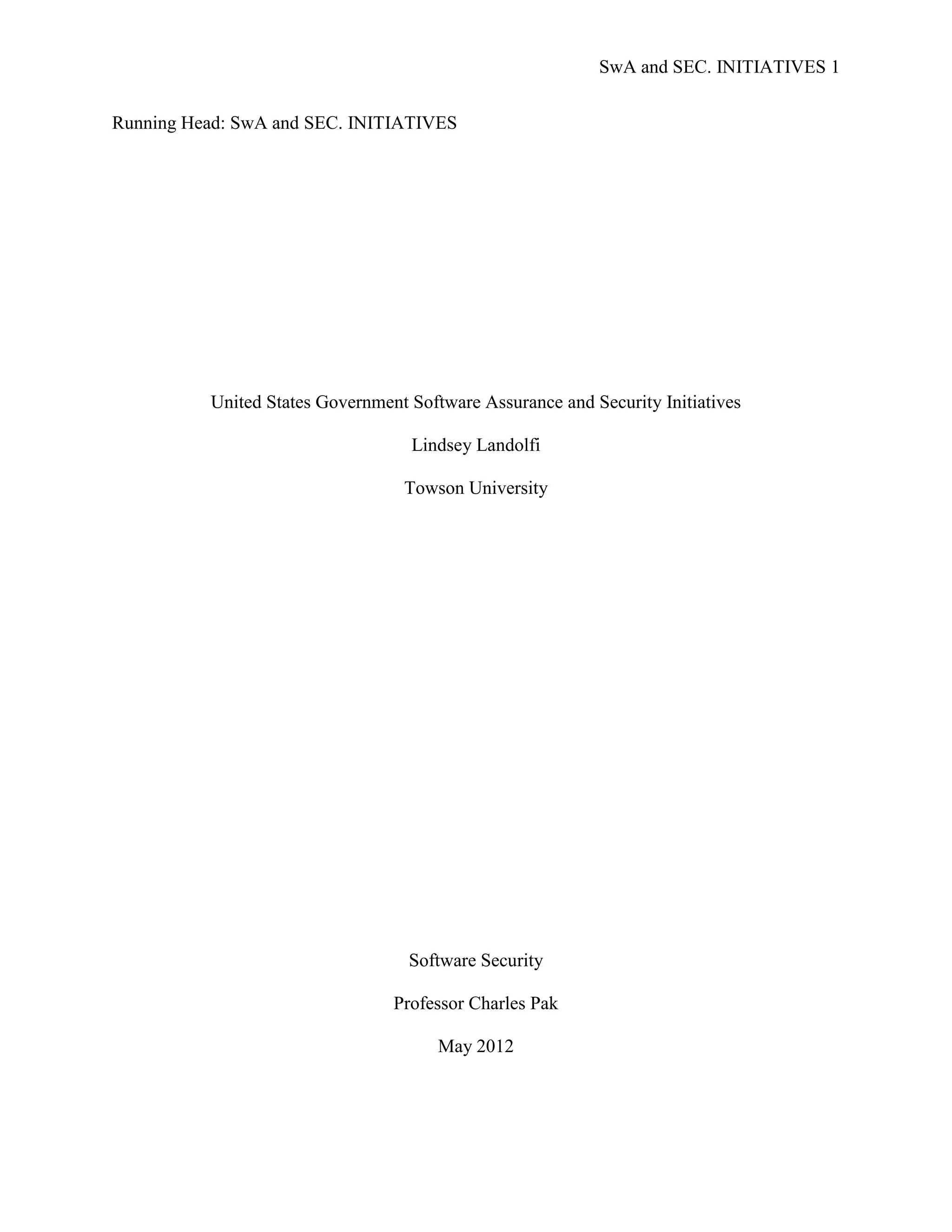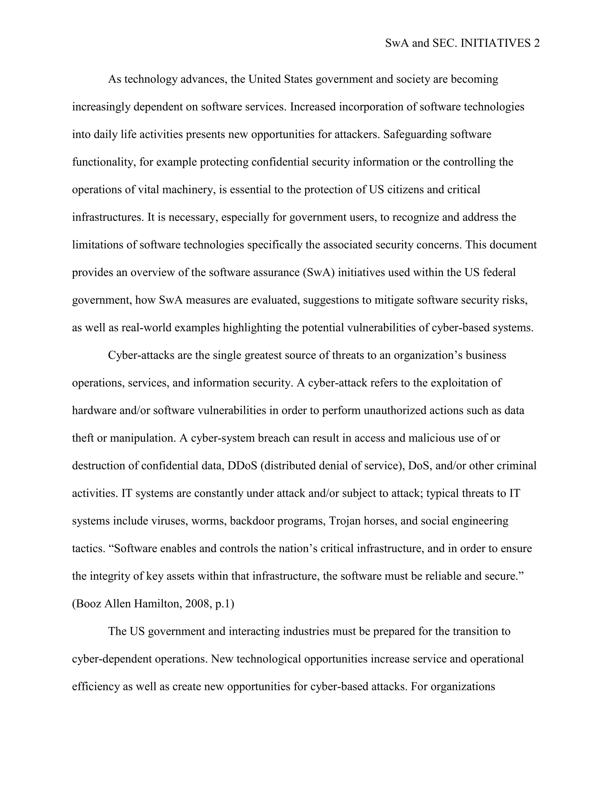 This document provides an overview of software assurance (SwA) initiatives within the US federal government. It discusses how the Department of Homeland Security established the National Cyber Security Division Software Assurance Program to promote software security, integrity, and resiliency. It also describes the development of a common measurement framework to help organizations implement security best practices throughout the software development lifecycle. Finally, it analyzes security risks and mitigation strategies for Supervisory Control and Data Acquisition (SCADA) systems used in critical infrastructure through examples like the Stuxnet malware.