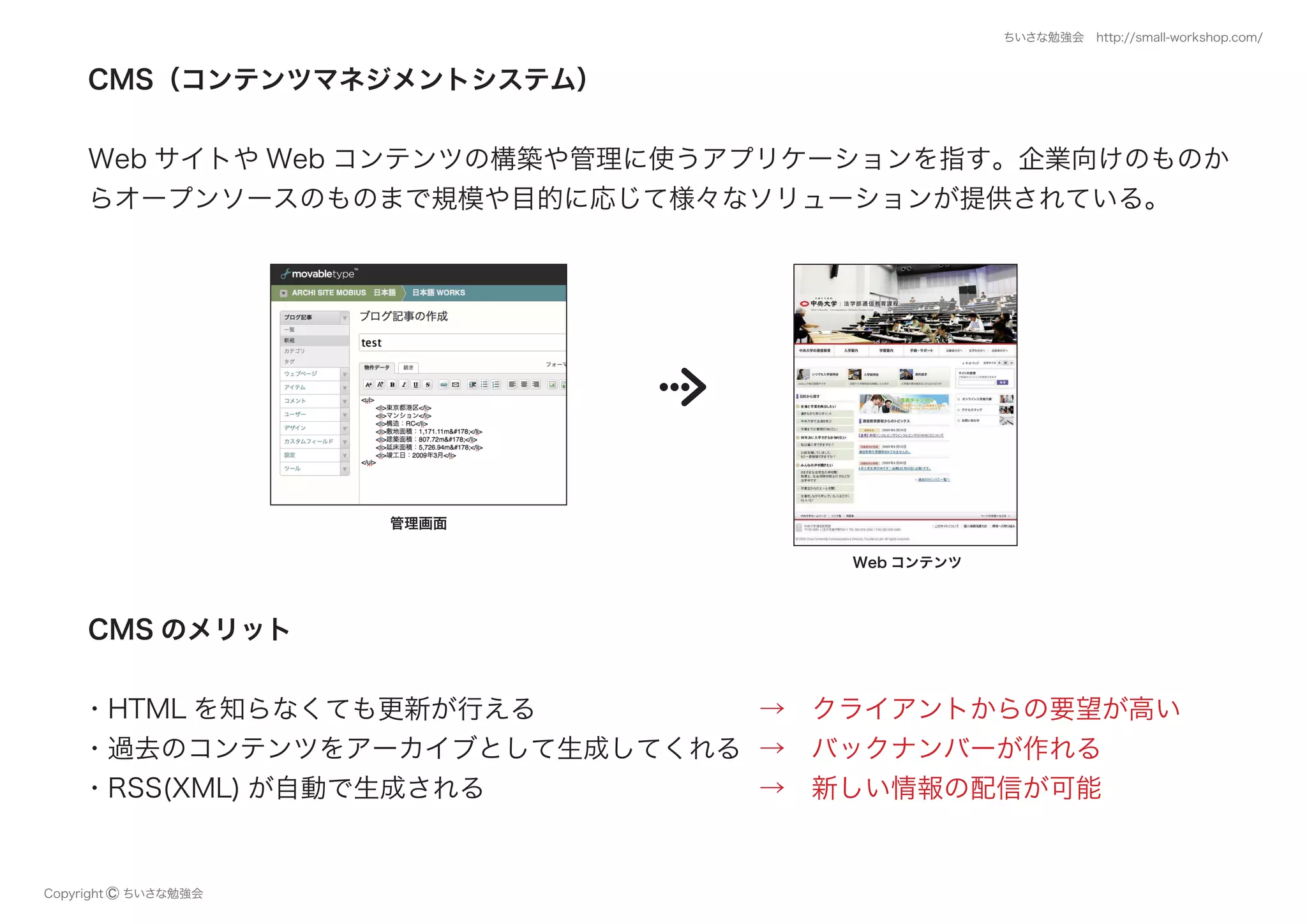 CMS(コンテンツマネジメントシステム) 管理画面 Web コンテンツ CMS のメリット Copyright © ちいさな勉強会