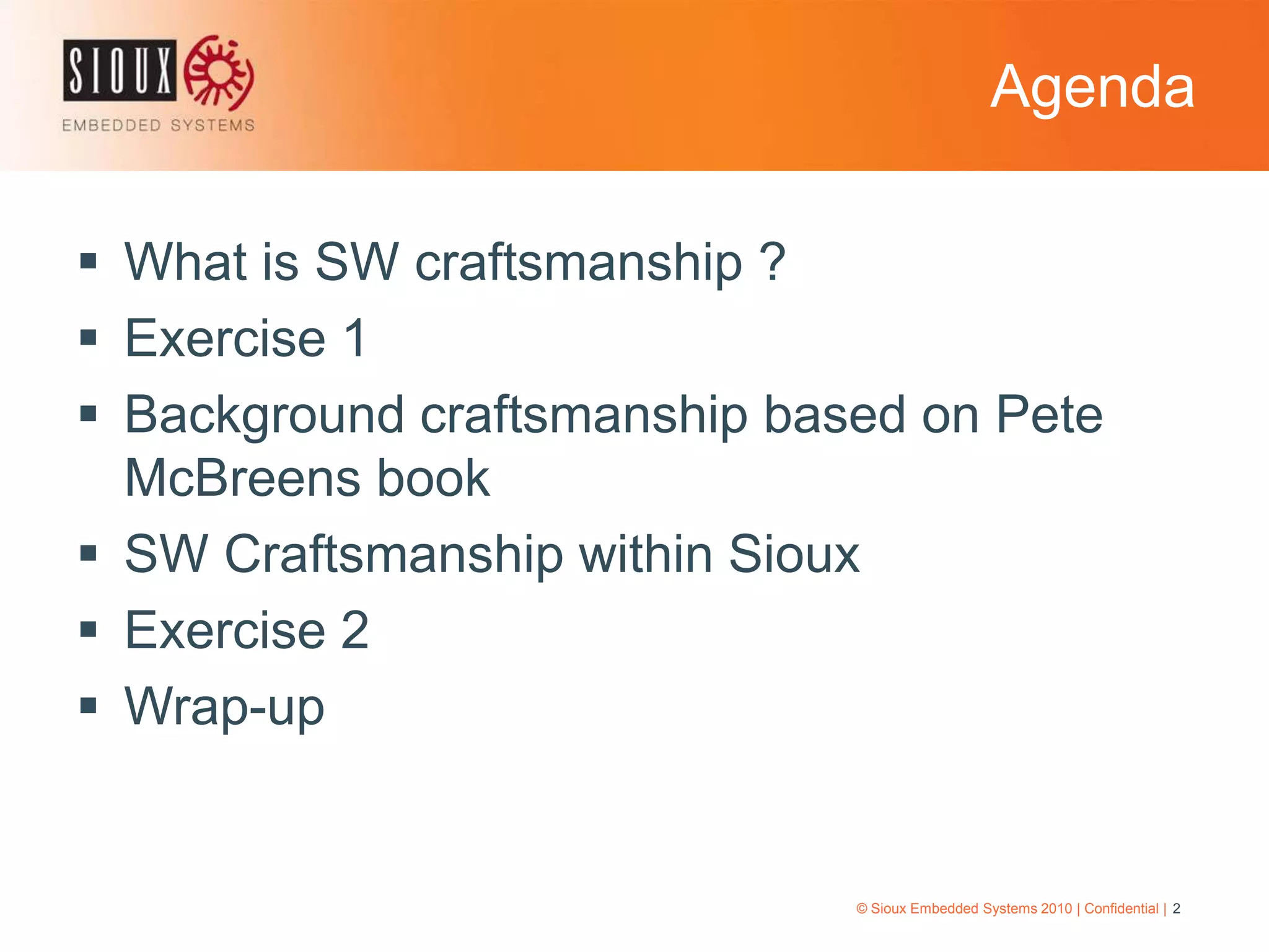 This document discusses software craftsmanship. It outlines an agenda for a weekend code session including exercises on what skills belong to software craftsmanship. It summarizes a book on software craftsmanship which uses the metaphor of traditional craftsmanship with masters, journeymen and apprentices. The document proposes establishing a software craftsmanship think tank to improve skills through mentoring, lunch sessions and defining engineering skills. It outlines upcoming activities like courses and guest speakers to further the topic of software craftsmanship.