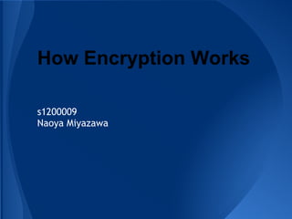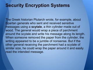Symmetric key encryption uses a secret key that is shared between two computers to encrypt and decrypt messages sent between them. Public key encryption addresses the weakness of needing to securely share a key beforehand by using a hashing algorithm to generate keys from input values, making it nearly impossible to derive the original input without knowing the data used to create the hash. A popular implementation of public key encryption is Secure Sockets Layer (SSL) and its successor Transport Layer Security (TLS), which are Internet security protocols used by browsers and servers to transmit sensitive information securely.