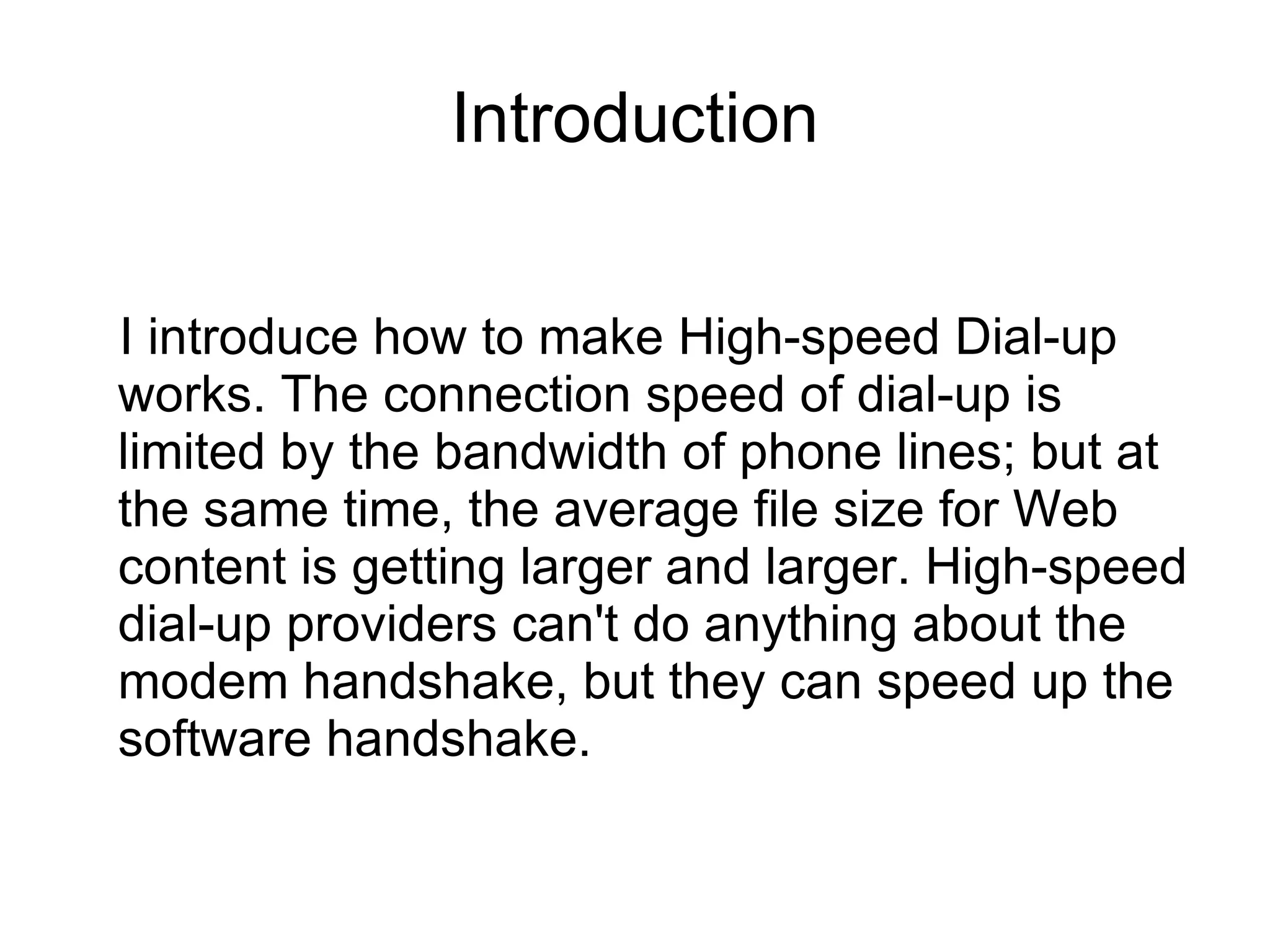 This document discusses how high-speed dial-up internet works. It explains that high-speed dial-up providers use acceleration servers and special software to reduce the handshake time by up to 50%. They also use lossless file compression, filtering, and caching techniques to speed up data transmission over phone lines for users who cannot access broadband internet. While dial-up speeds are limited by phone line bandwidth, these methods can prolong the usefulness of dial-up and provide an alternative for those not ready to switch to broadband.