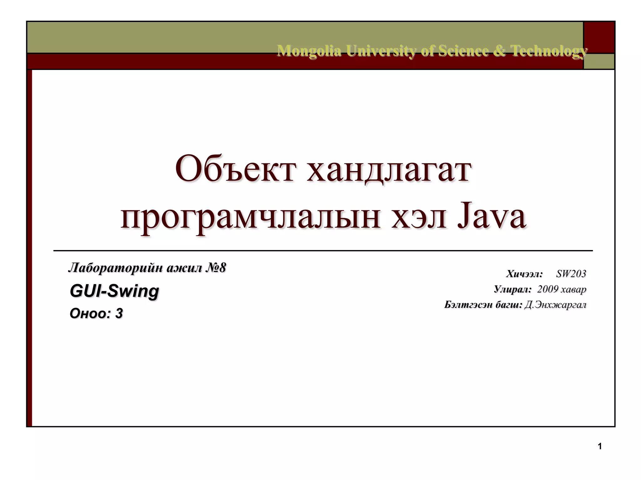 Science & Technology Объект хандлагат програмчлалын хэл Java Лабораторийн ажил №8 Хичээл: SW203 GUI-Swing Улирал: 2009 хавар Бэлтгэсэн багш: Д.Энхжаргал Оноо: 3 1