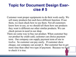 The document discusses a company that sells various products with different functions. It explains that customers may not know how to use the products, so the company provides instructions. It also notes that customers can choose different payment terms, such as paying with a credit card over 1-12 months or by check which requires more time to clear.