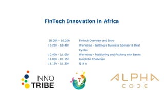 The document outlines the fintech innovation landscape in Africa, emphasizing the role of corporate partnerships and the challenges of accessing market opportunities. It discusses the various workshops and programs offered by SW7, Africa's first fintech accelerator, aimed at supporting technology businesses from ideation to exit. Key topics include the importance of customer adoption, the constraints posed by legacy systems, and the need for business models that drive financial inclusion.
