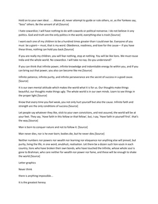 Swami Vivekananda delivers a series of motivational messages encouraging strength, courage, perseverance, purity, and faith. He emphasizes that all power is within ourselves and tells his followers to have faith in their own abilities. He stresses the importance of remaining steadfast to one's ideals and working hard without expectation of reward from others.