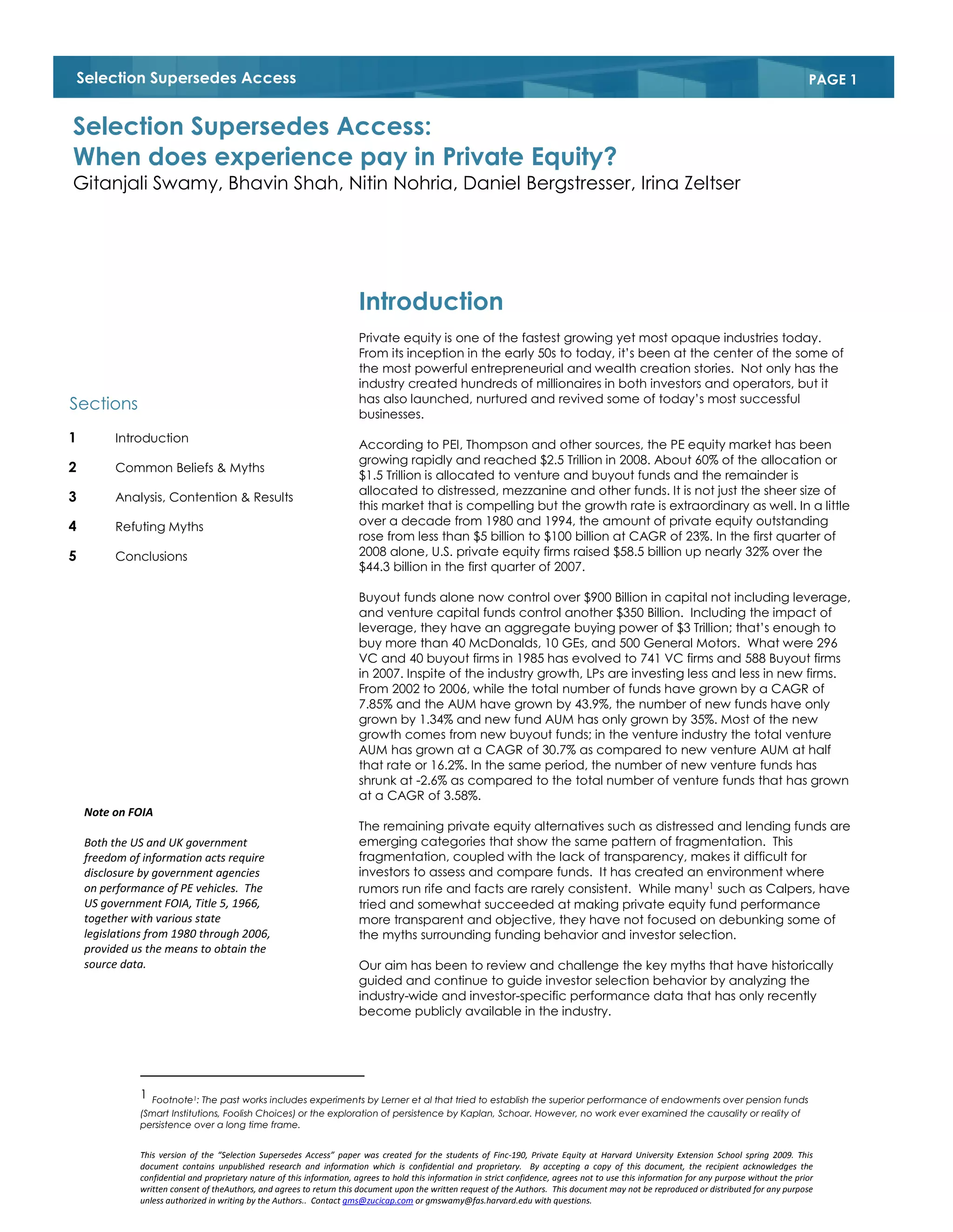 This document discusses common myths and beliefs in private equity, specifically regarding whether investing in successive funds of the same firms is safer and more rewarding than investing in emerging managers. The authors analyzed private equity performance data to test this myth. Their analysis found no evidence that persistence, or consistently strong performance, exists among private equity fund managers. Instead, the data showed that performance varied significantly across funds for the same managers. The authors conclude that investment selection is more important than sticking with established brands in private equity.
