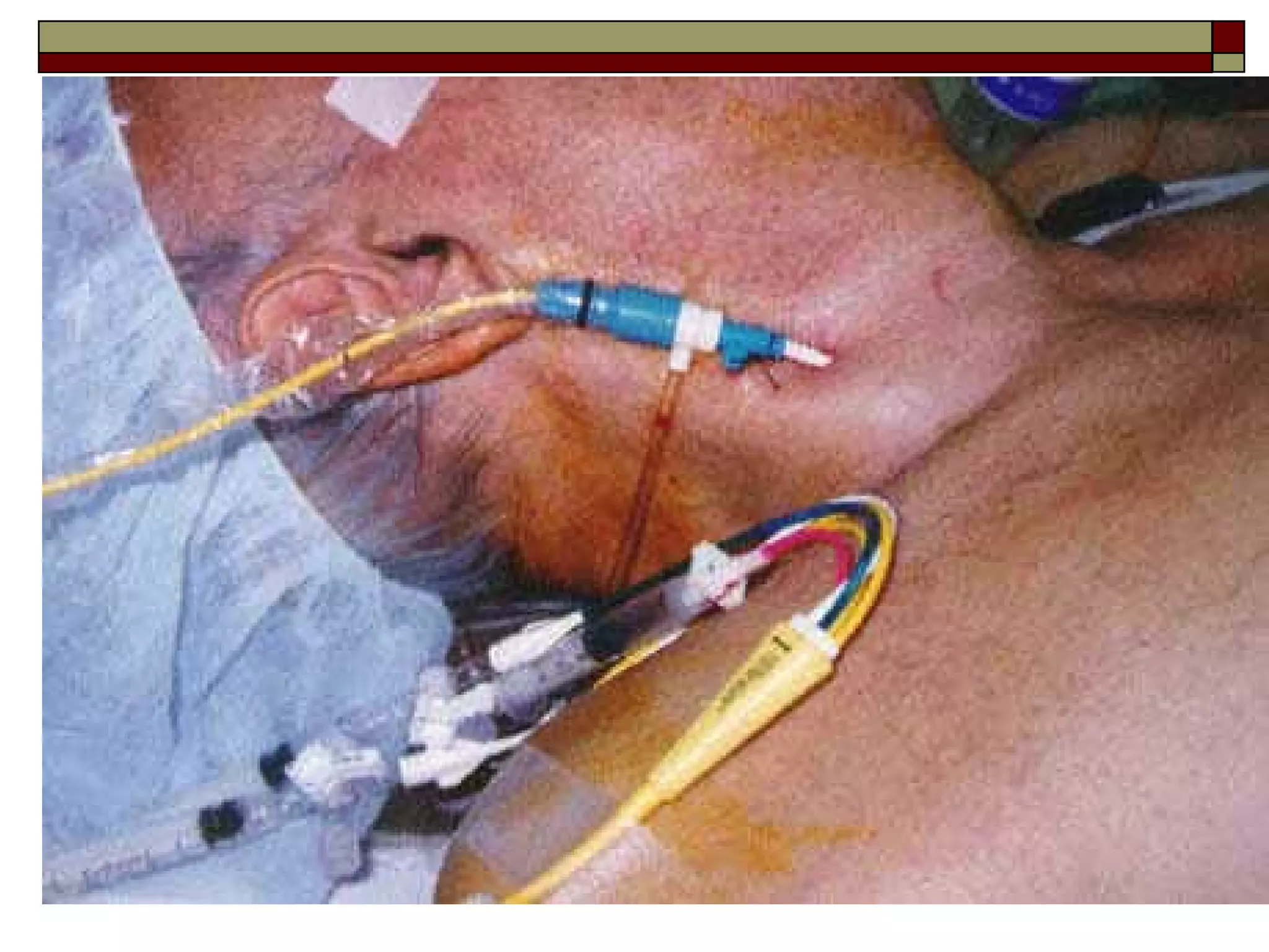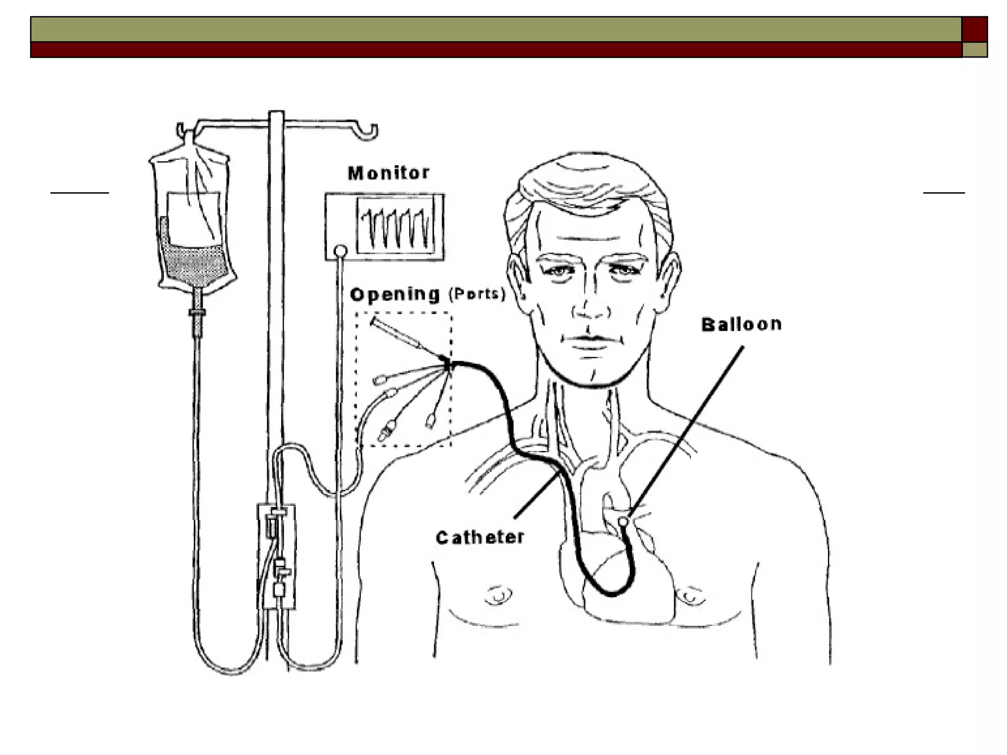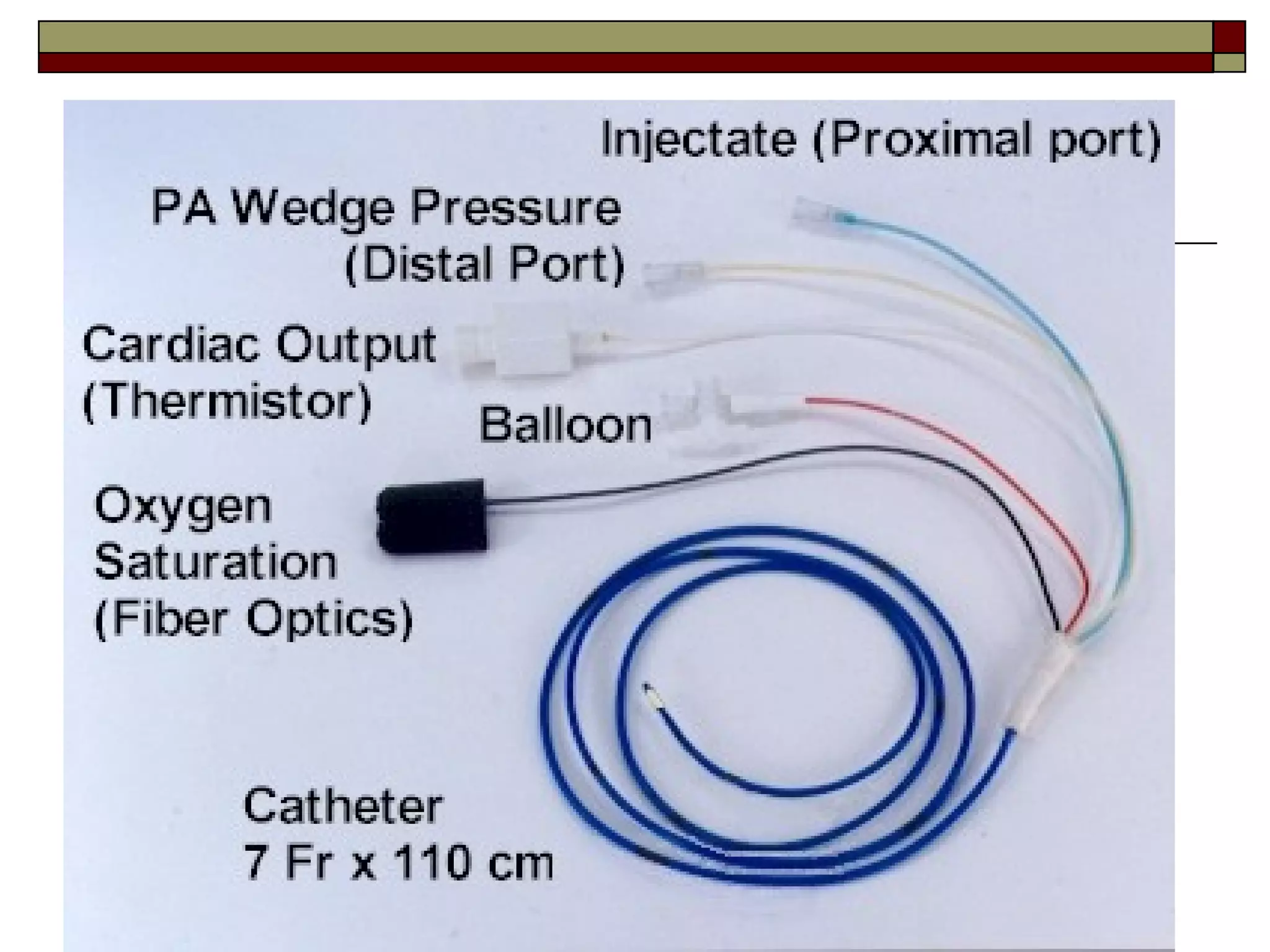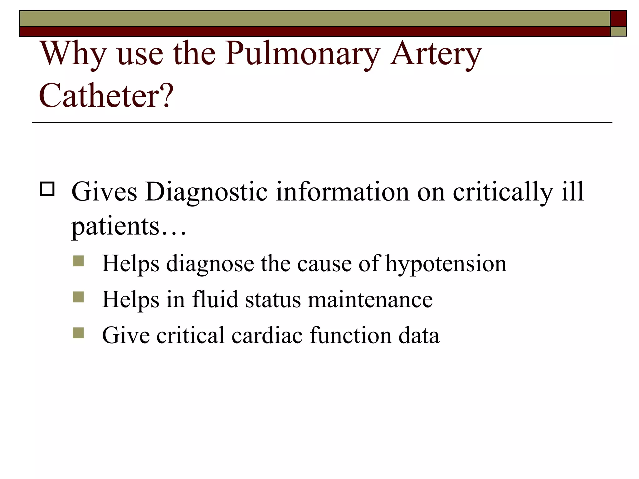 The pulmonary artery catheter, also known as a Swan-Ganz catheter, provides diagnostic information about critically ill patients by measuring pressures and oxygen saturation in the pulmonary artery, right atrium and right ventricle. It gives continuously monitored values like pulmonary artery pressure, central venous pressure and mixed venous oxygen saturation. Intermittently monitored values include pulmonary capillary wedge pressure and cardiac output. Derived calculations include systemic and pulmonary vascular resistances and cardiac index. The catheter is positioned from the subclavian vein through the right side of the heart into the pulmonary artery.