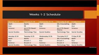 This document provides an overview of staff, classes, schedules, and other important information for the Swann Administration. It lists the principal, assistant principals, and other staff. It also details the core classes of math, ELA, science, and social studies as well as encore classes like art, music, and PE. The document includes the schedule for the first few weeks of remote learning and information on live office hours, navigating Canvas and Nearpod, important links, FAQs, and the requirement for 7th grade vaccinations.
