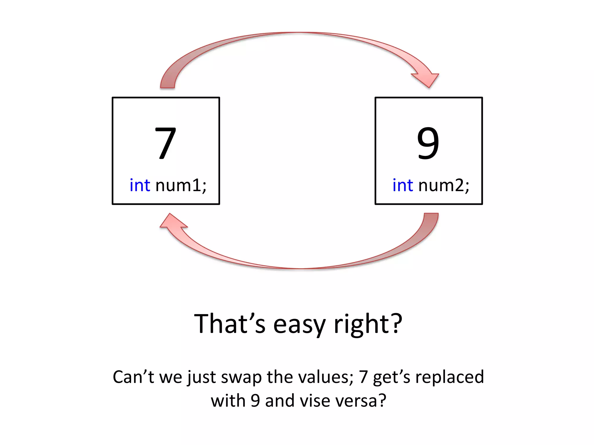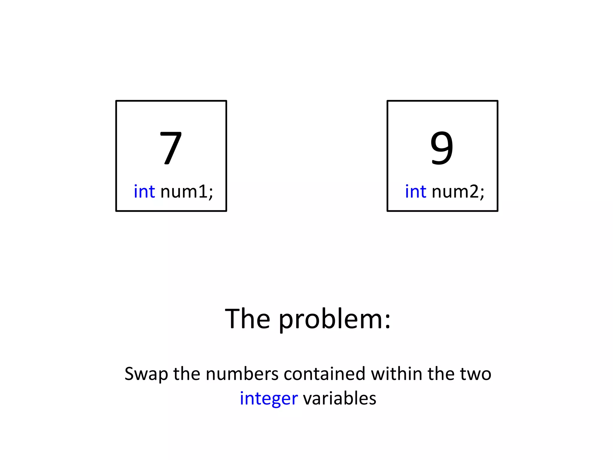 The document describes how to swap the values of two integer variables, num1 and num2, using a third temporary variable temp. Since directly swapping the values would lose the original value of num2, a third variable temp is used to hold the value of num2 while the value of num1 is moved to num2. Then the saved value from temp can be moved into num1, completing the swap.