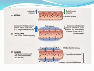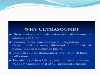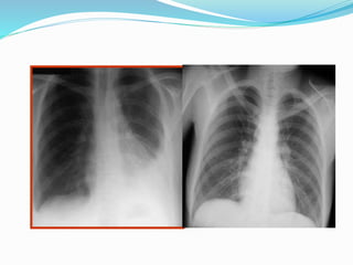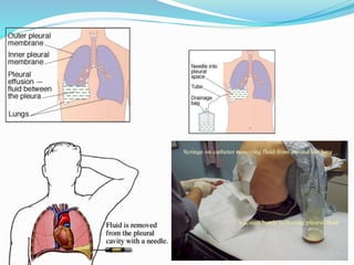 Pleural effusion occurs when an abnormal amount of fluid collects in the pleural space between the lungs and chest wall. It can be caused by conditions that increase hydrostatic pressure or decrease oncotic pressure (transudative), or by inflammation from infections, cancer, pulmonary embolism (exudative). Symptoms include shortness of breath, cough, and chest pain. Diagnosis involves chest x-ray and thoracentesis to analyze fluid. Treatment focuses on resolving the underlying cause, relieving symptoms by draining fluid, and preventing reaccumulation through procedures like pleurodesis. Nursing care centers around breathing treatments, pain management, infection prevention, and monitoring for complications.