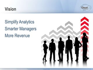 The document outlines Cloud9's vision to simplify analytics and make managers smarter in order to increase revenue. It discusses Cloud9's performance management applications that detect problems, ask the right questions, and enable corrective action. The solution has led to a 300% increase in subscribers from 2009 to 2010. Product enhancements like simplified user experience, rotators, and custom hierarchies are improving the solution. Customer testimonials praise improved communication, consistency, and forecast accuracy. The document announces an upcoming product process discussion and keynote on best practices.