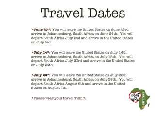 This document provides information for a service trip to Swaziland, including travel dates from the US to Johannesburg and then to Swaziland, meeting details upon arrival in Johannesburg, luggage requirements, necessary items to bring to communities, food for travel, activities planned for communities, dress code, and other logistical details.