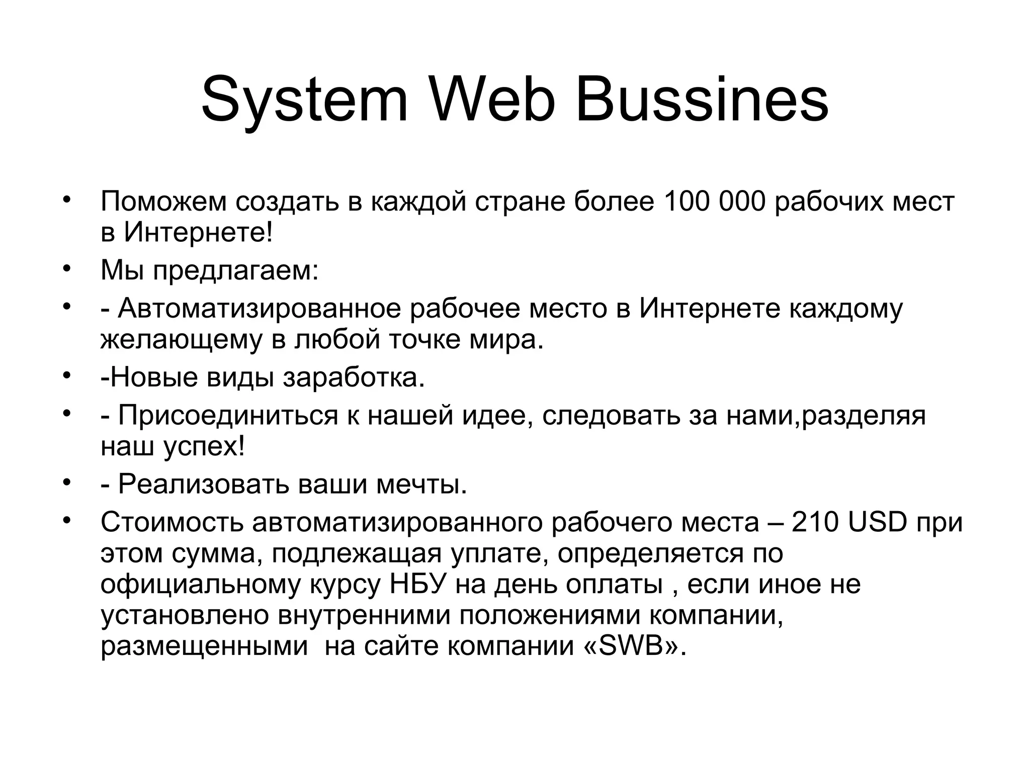 Документ описывает возможность стать партнером компании SWB System Web Business, предлагающей автоматизированные рабочие места для создания интернет-работы в каждой стране. За 210 USD партнеры могут строить свои сети, получая комиссионные от подписанных ими участников и их доходов. Компании также обеспечивают карьерный рост и гибкую бонусную систему.
