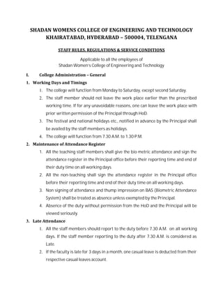 The document outlines staff rules and regulations for Shadan Women's College of Engineering and Technology. Some key points include: