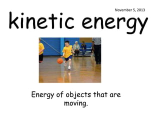This document discusses different types of energy including kinetic energy, which is the energy of moving objects; potential energy, which is stored energy that can create motion; mechanical energy, which is the energy of objects with moving parts; and magnetism, which is the physical property of attracting to a magnet. Each type of energy is defined in a separate entry dated November 2013.